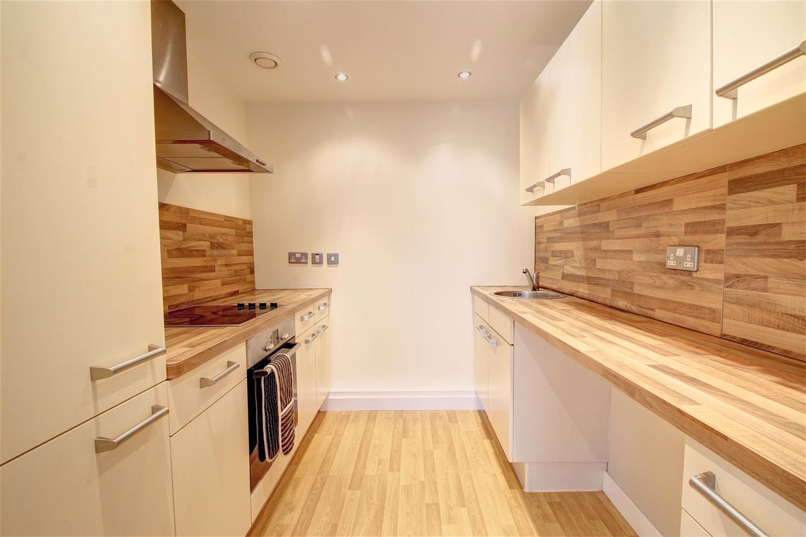 Range of wall and base units with roll edge worktop surfaces incorporating stainless steel circular sink unit with mixer tap, splashbacks, integrated electric oven and hob with stainless steel extractor above, fridge and freezer, dishwasher, ceiling spotlights.