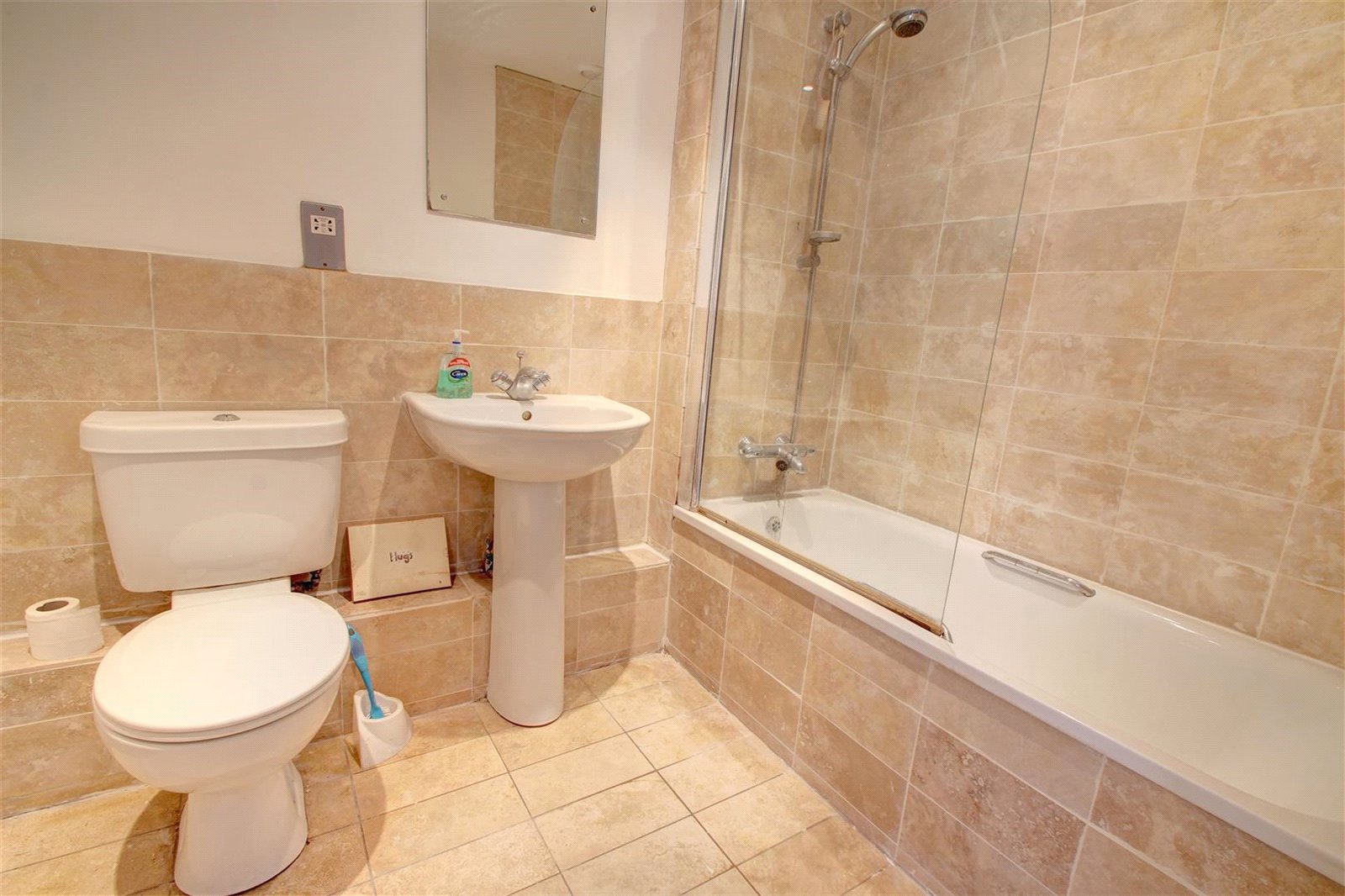 Panel bath with shower attachment, pedestal wash basin, WC, part tiled walls, tiled flooring, ceiling spotlights.