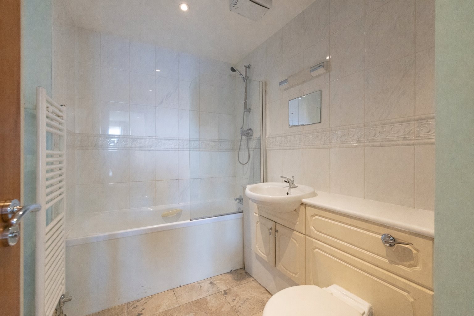 The ensuite features a white suite with a bath and shower fitted with a glazed shower screen, an inset basin, and a WC. It also includes a tiled splashback with vanity lighting, an extractor fan, and a heated towel rail. A Jack & Jill door provides additional access to the hallway.