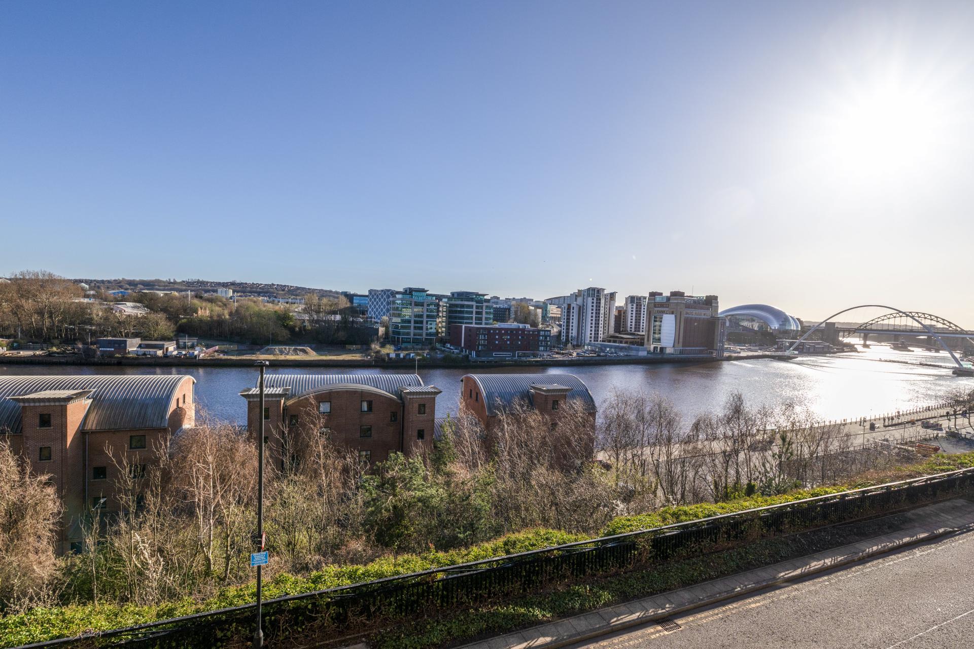 Living space featuring two central heating radiators and doors opening to a Juliette balcony, offering views along the River Tyne, including the Millennium Tyne Bridge, as well as the Baltic Flour Mills and the Glass House Theatre.