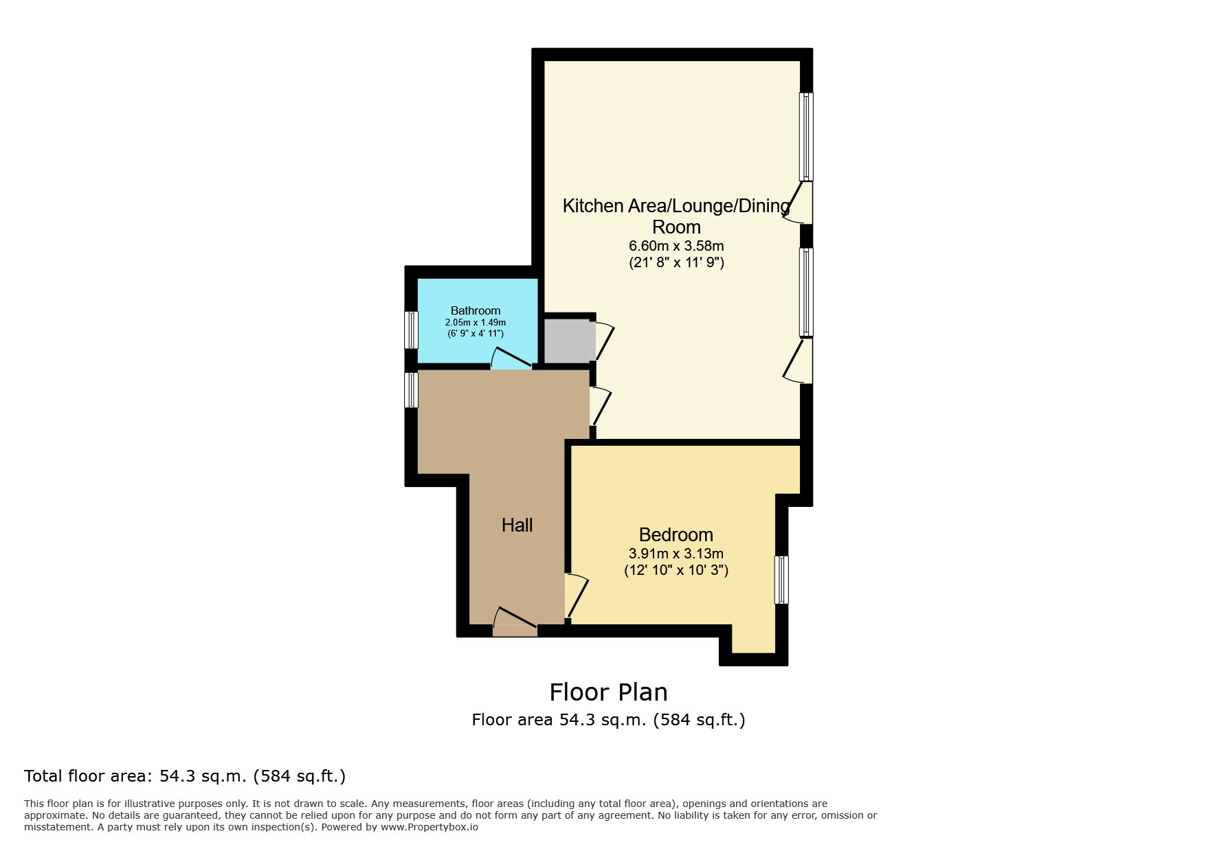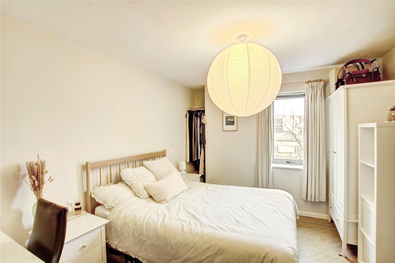 Double glazed doors leading to juliet balcony, storage cupboard housing hot water cylinder, television aerial and telephone points, wall mounted electric heater.