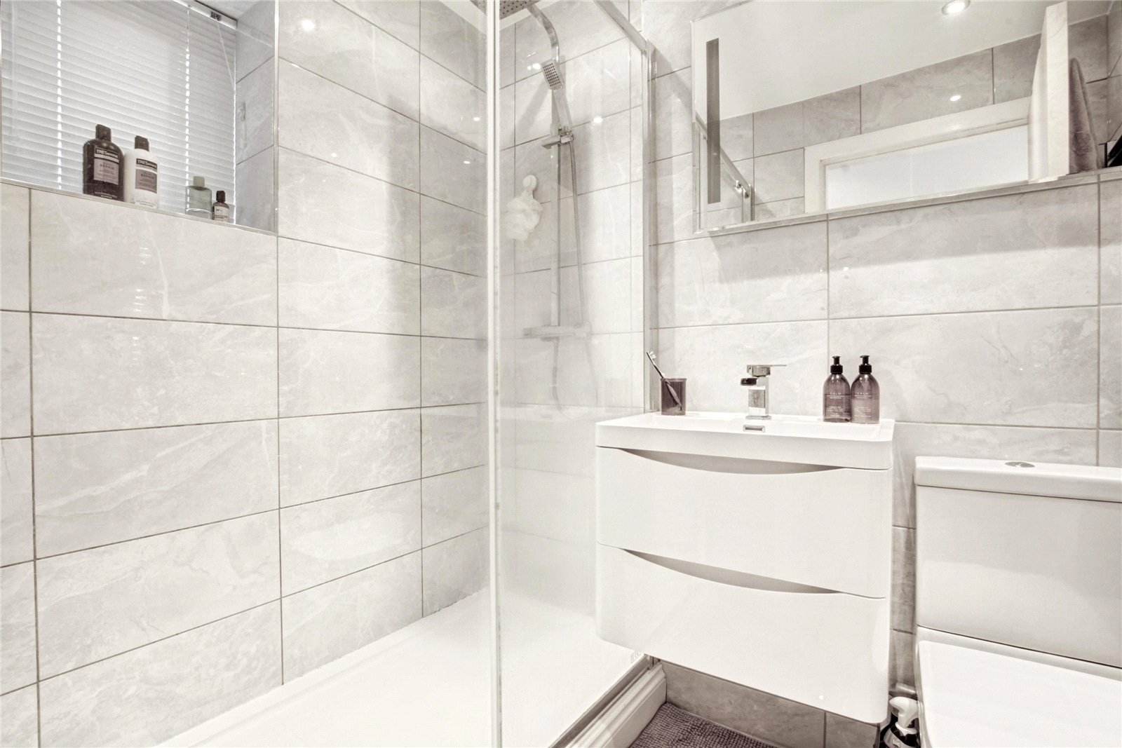 Double glazed window to rear elevation, shower cubicle with tiled walls, WC, wash hand basin, heated towel rail.