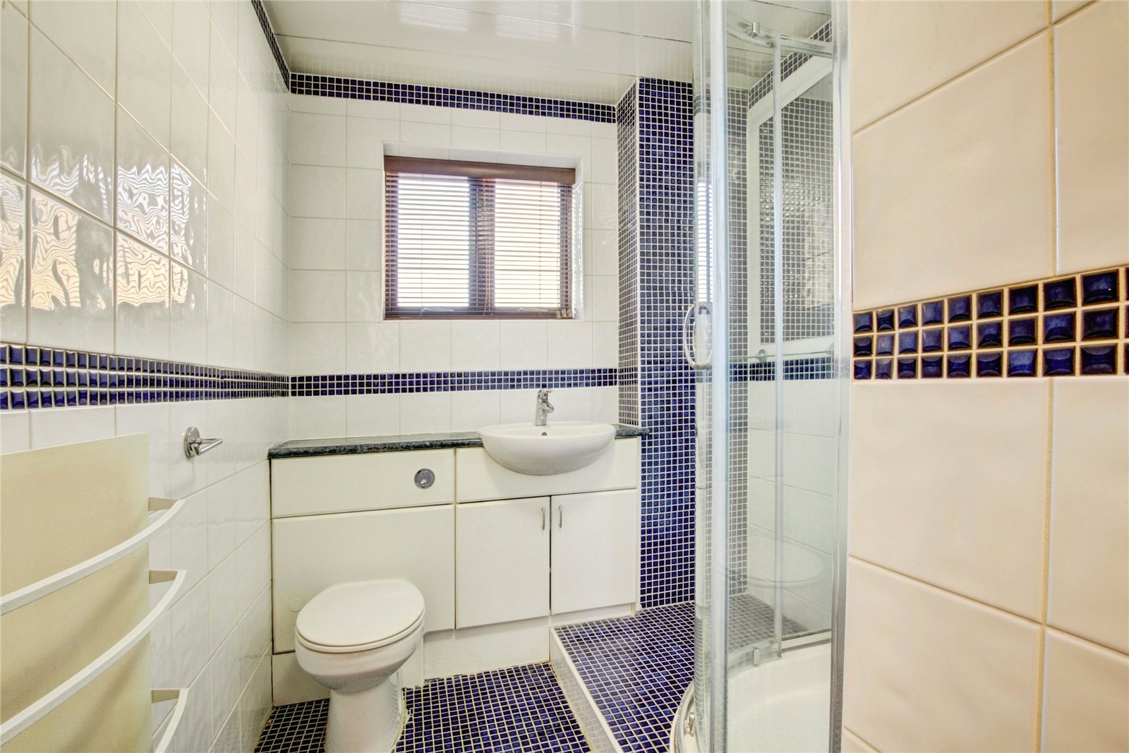 Corner shower in tiled cubicle with glass doors, wash hand basin set in vanity unit, WC, fully tiled walls, mounted towel rail radiator, tiled flooring, double glazed window.