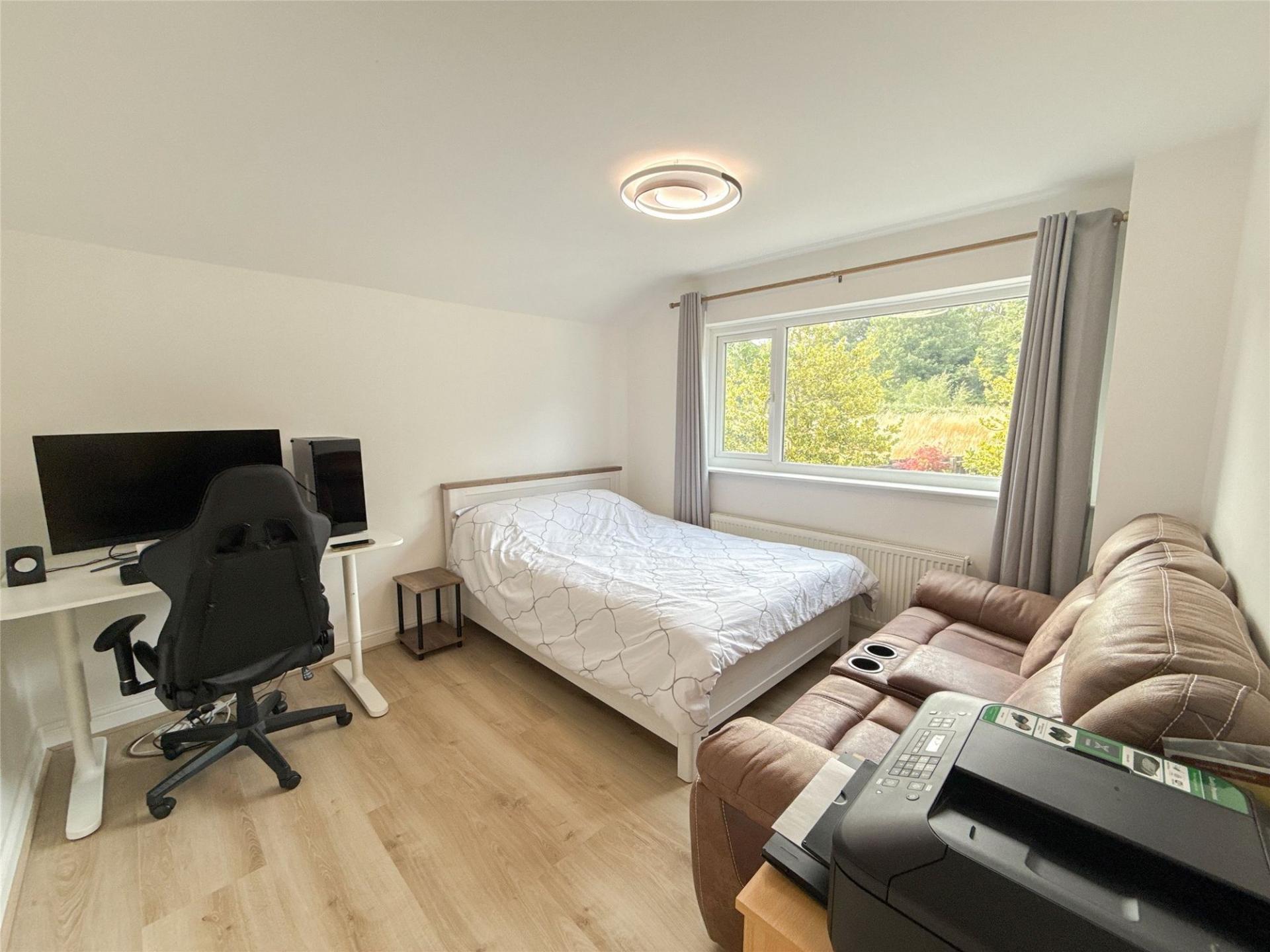 Also located on the ground floor is a versatile additional room, currently configured as a bedroom, but equally suited for use as a second reception room, playroom, home office, or hobby space—offering flexibility to meet the needs of modern families. A stylish shower room featuring a double shower with a mains-fed rainfall-style shower, a sleek floating vanity unit with an inset wash basin, and a low-level WC. A useful utility room provides additional storage and laundry facilities, helping to keep the main living areas clutter-free.