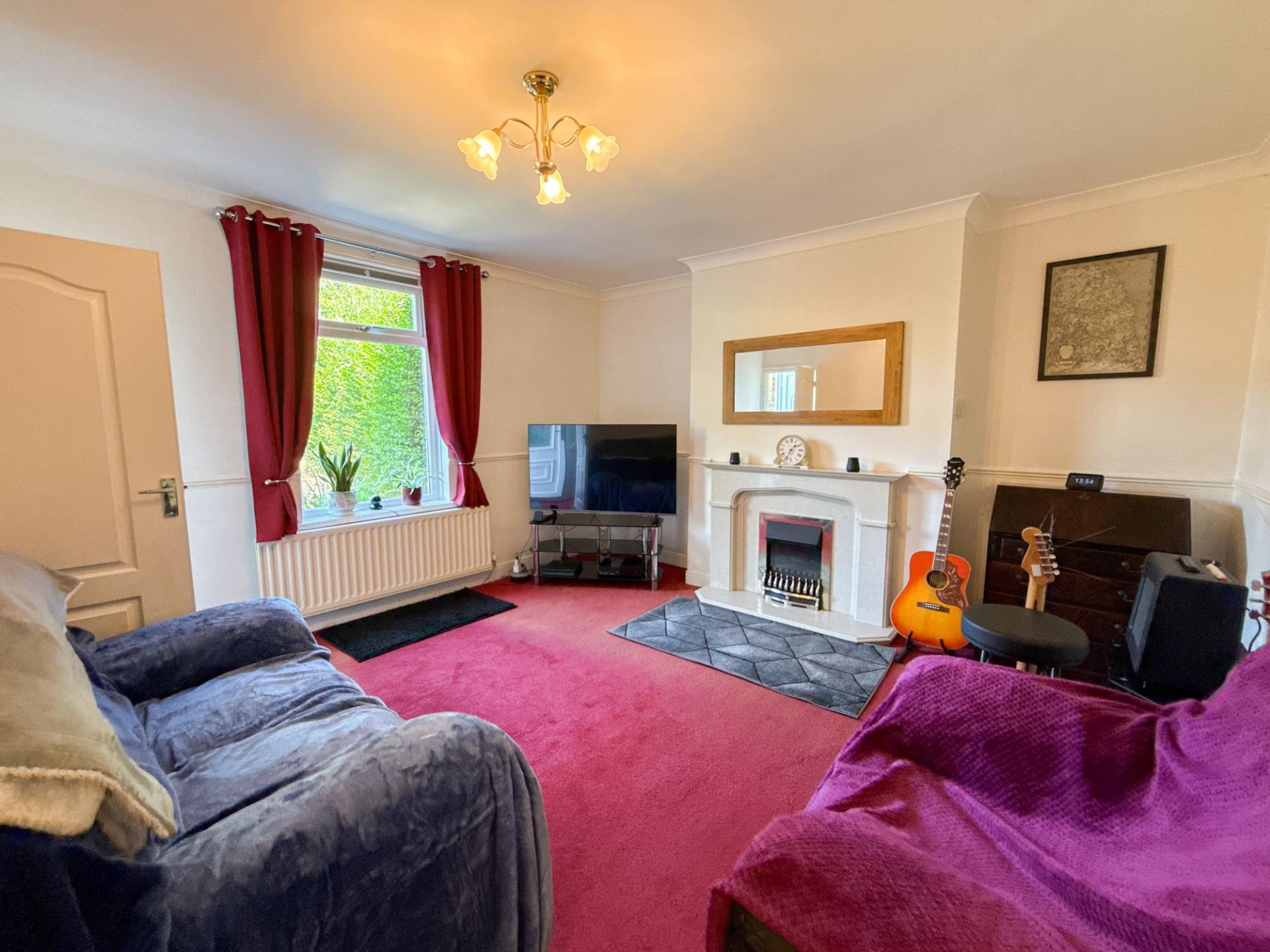The ground floor features a welcoming lounge with a focal point fireplace set into the chimney breast and providing a charming space to relax and unwind. To the rear of the home, a generously sized dining kitchen offers ample space for family meals and entertaining. Fitted with a range of units and work surfaces, the kitchen also has space for appliances and includes a rear access door leading out to the enclosed garden – perfect for outdoor dining or children’s play during the warmer months.
