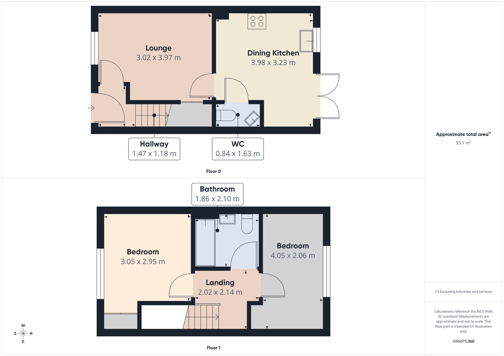 Upstairs, the property boasts two generously sized double bedrooms and a modern family bathroom featuring a sleek white suite with a mains-fed shower over the bath.