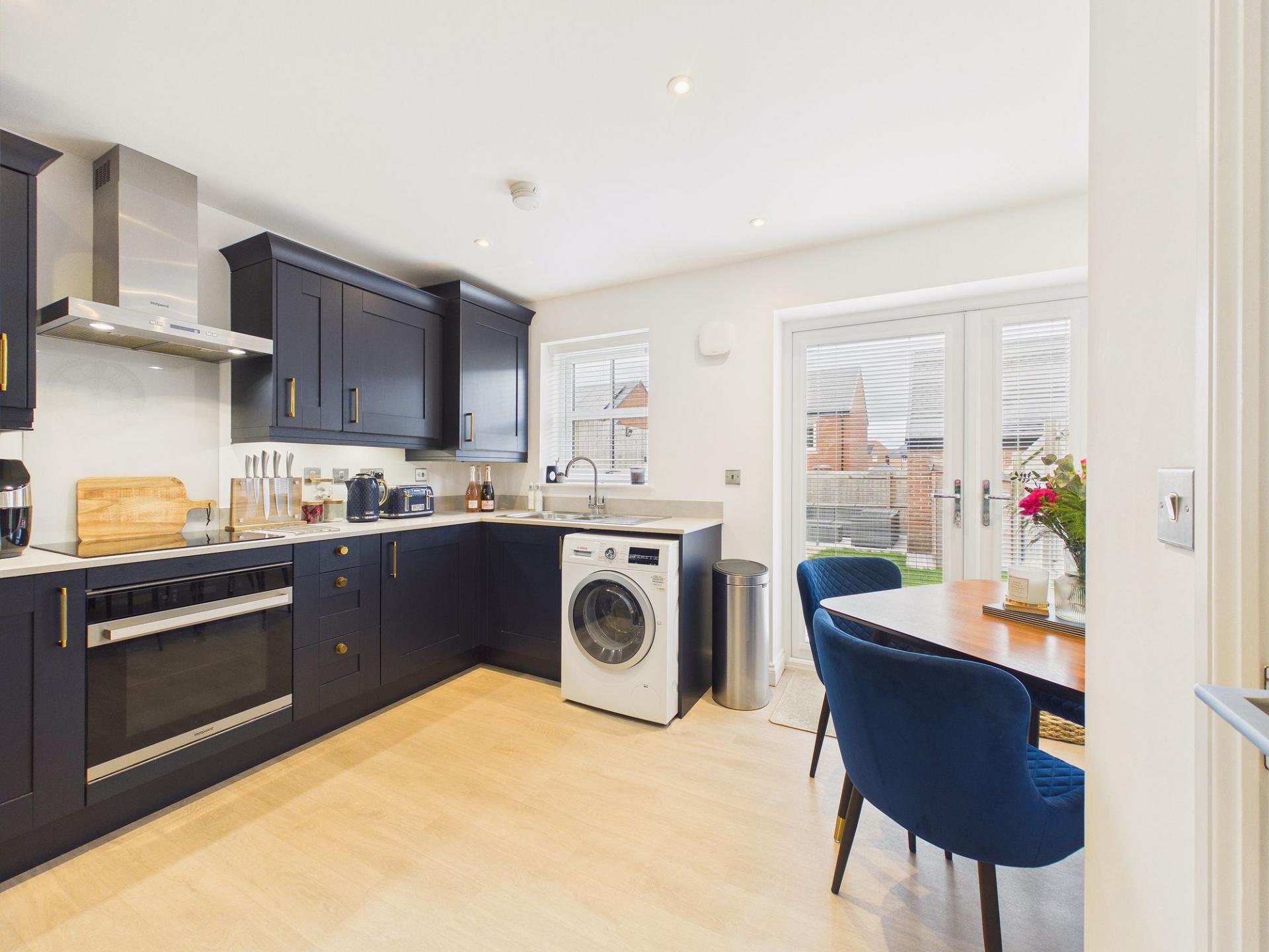 The accommodation begins with a welcoming entrance hallway leading into a stunning front-facing lounge, tastefully decorated and offering comfortable living space. To the rear of the property is an impressive dining kitchen, fitted with a stylish range of wall and base units complemented by built in cooking appliances. Patio doors provide a seamless connection to the rear garden, allowing for indoor-outdoor living. A convenient downstairs wc completes the ground floor.