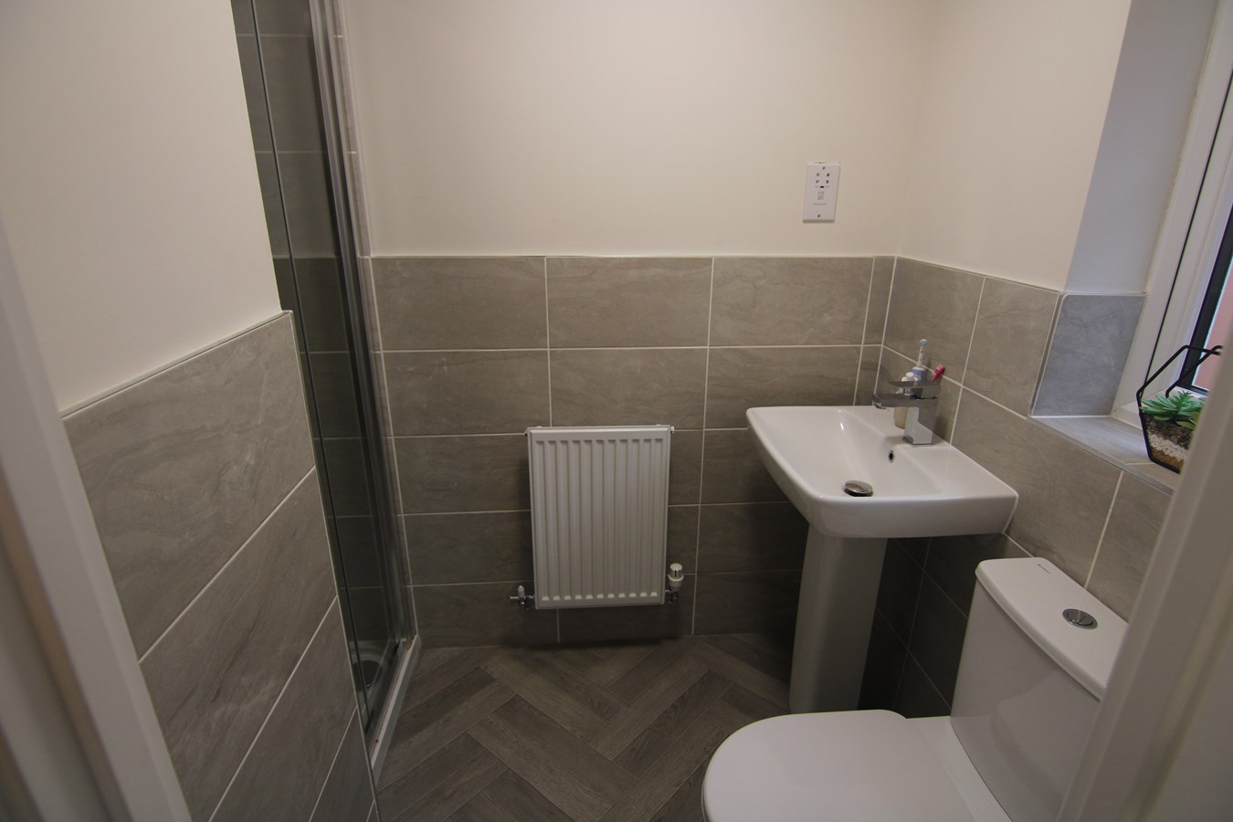 Bedroom One (Master) Front-facing, approximately 3.8m x 2.6m, featuring a gas central heating radiator, TV point, and a modern en-suite shower room comprising a shower cubicle, wash hand basin, and low-level WC.