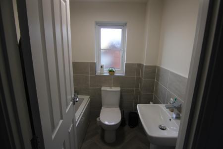 The family bathroom is fitted with a white suite including panelled bath, pedestal wash basin, and low-level WC, with part-tiled walls and gas central heating radiator.