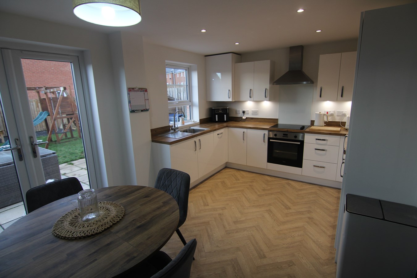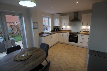 To the rear is a modern kitchen/breakfast room, measuring approximately 4.5m x 3.1m. The kitchen is fitted with a range of high-quality wall and base units with work surfaces, stainless steel sink with mixer tap, and a selection of integrated appliances including an electric oven, gas hob with extractor hood, washing machine, dishwasher, and fridge freezer. A door provides direct access to the rear garden.
