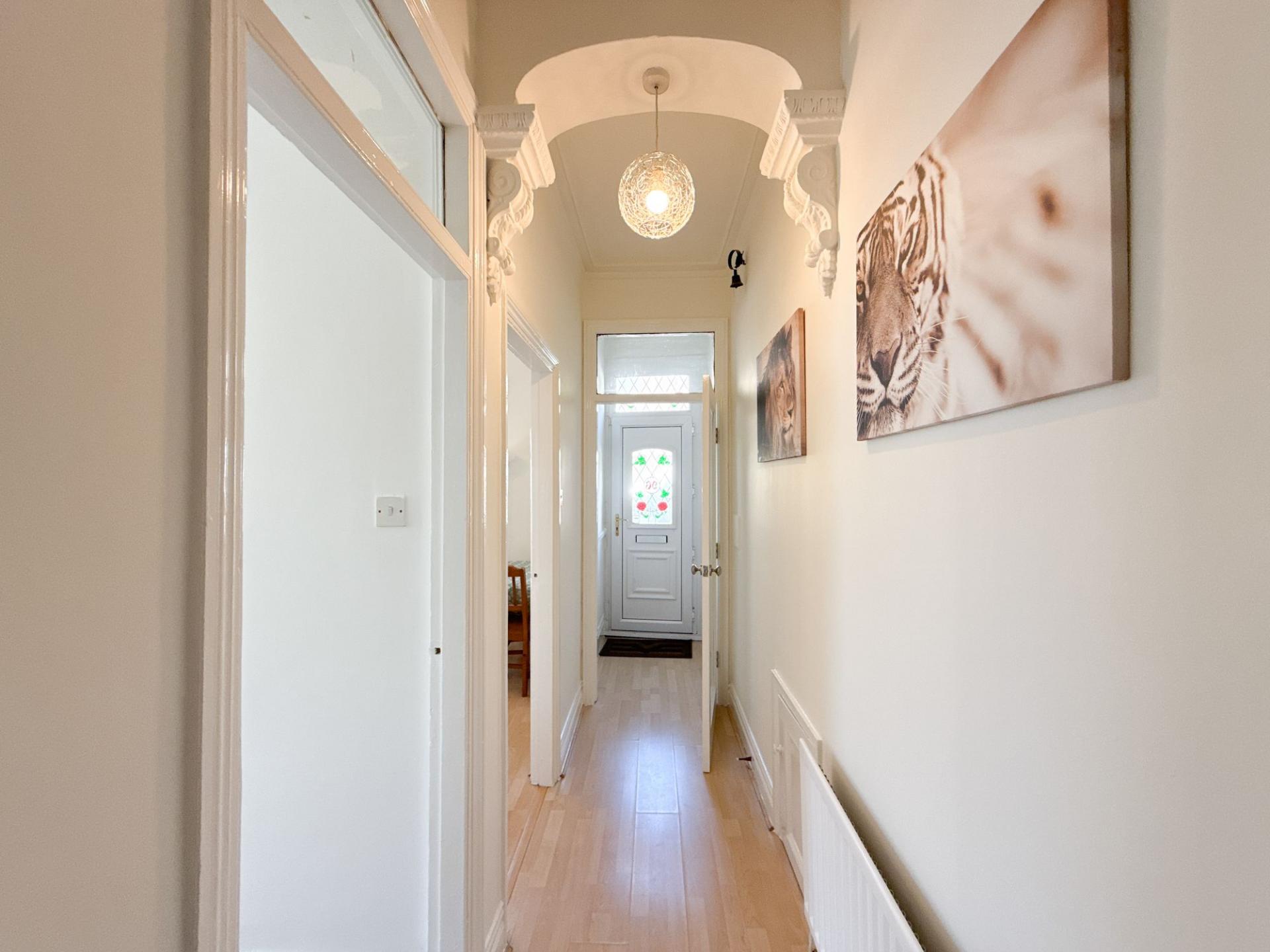 The accommodation immediately impresses with a traditional style wirepull doorbell at the property's entrance. The welcoming entrance lobby leads into the main hallway. Here, period-style details such as a decorative archway with corbels and coving to the ceiling create an elegant first impression and add character to the home.