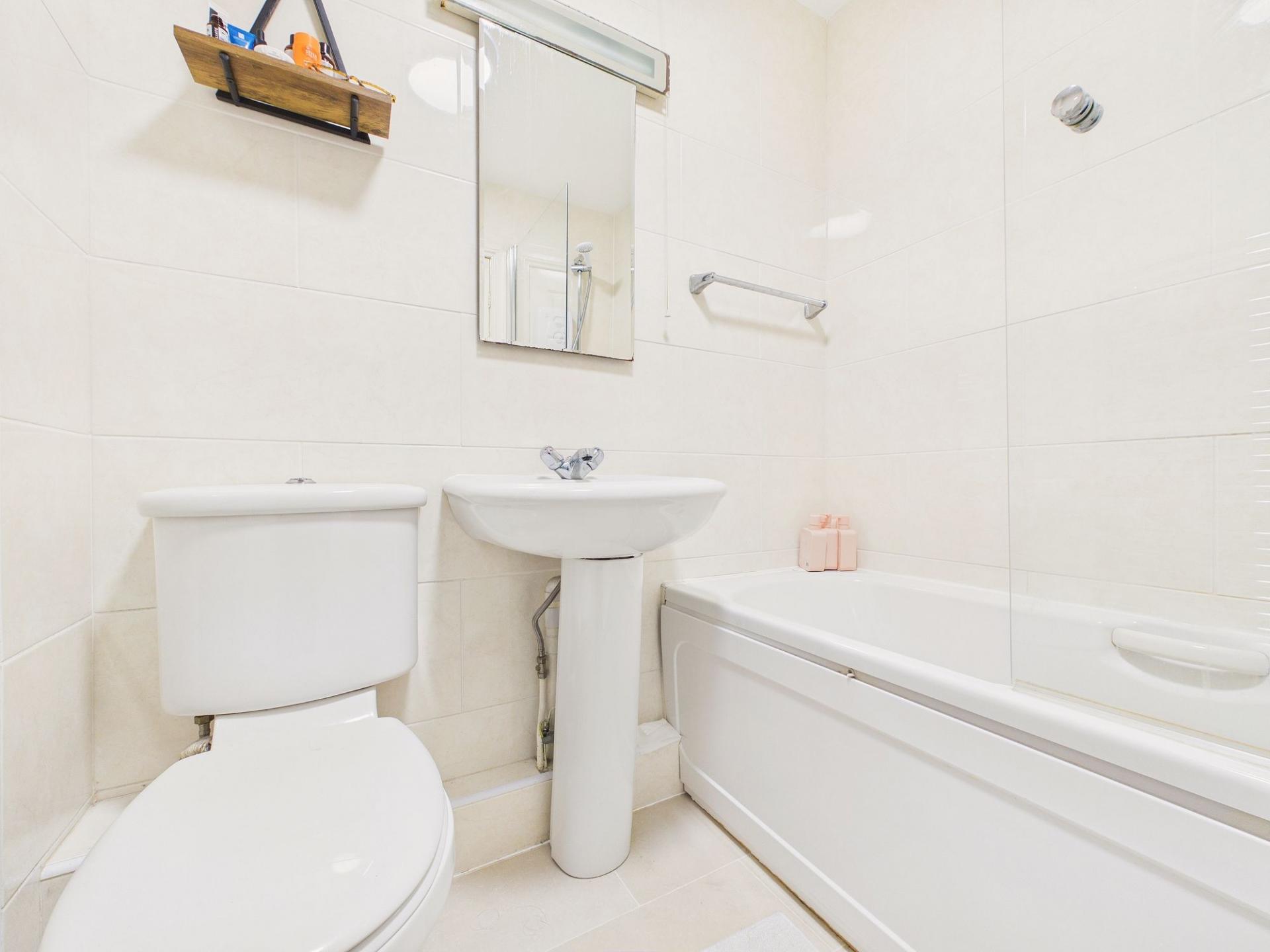 There are two generously sized double bedrooms, each offering comfortable living space, along with a bathroom fitted with a white suite and a shower facility over the bath.