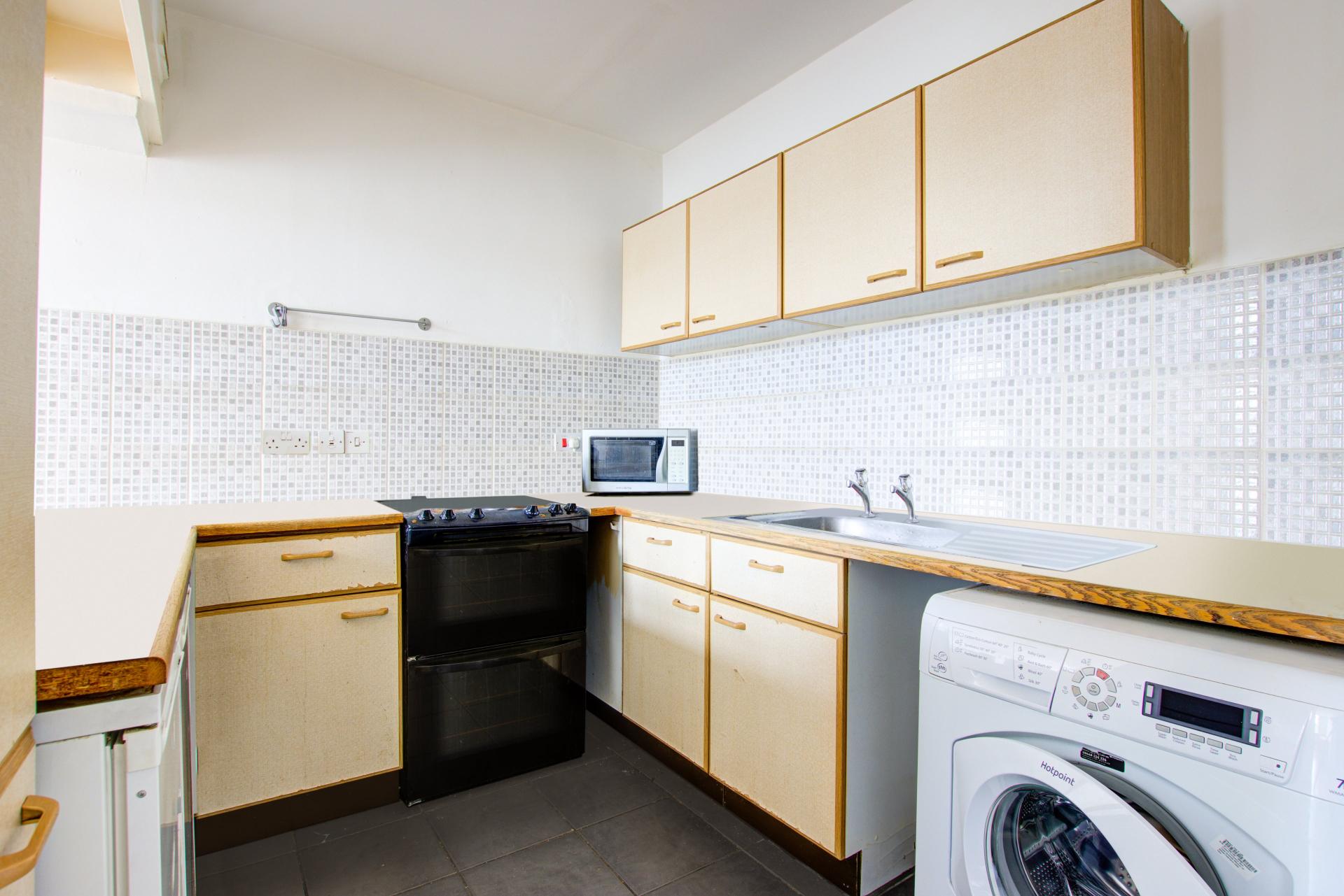 Partially open plan to the living room, fitted wall and floor units, stainless steel sink and drainer unit, electric cooker point, plumbed for washer, tiled splash back, tiled floor and cupboard with hot water cylinder.