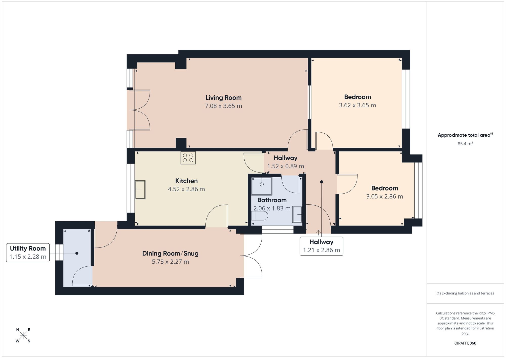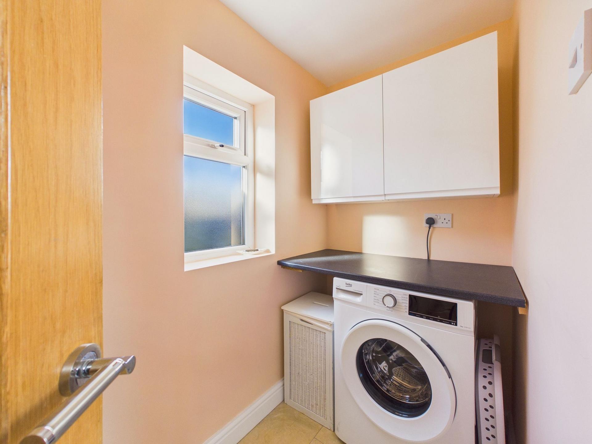 Completing the internal accommodation is a stunning bathroom, thoughtfully designed with modern fittings. It features a corner shower enclosure with a mains-fed rainfall style shower, a low-level WC, and a hand wash basin set within a stylish vanity unit which provides useful storage while maintaining a sleek, modern finish. In addition, a useful utility room adds further practicality to the home, offering space for laundry appliances and additional storage.