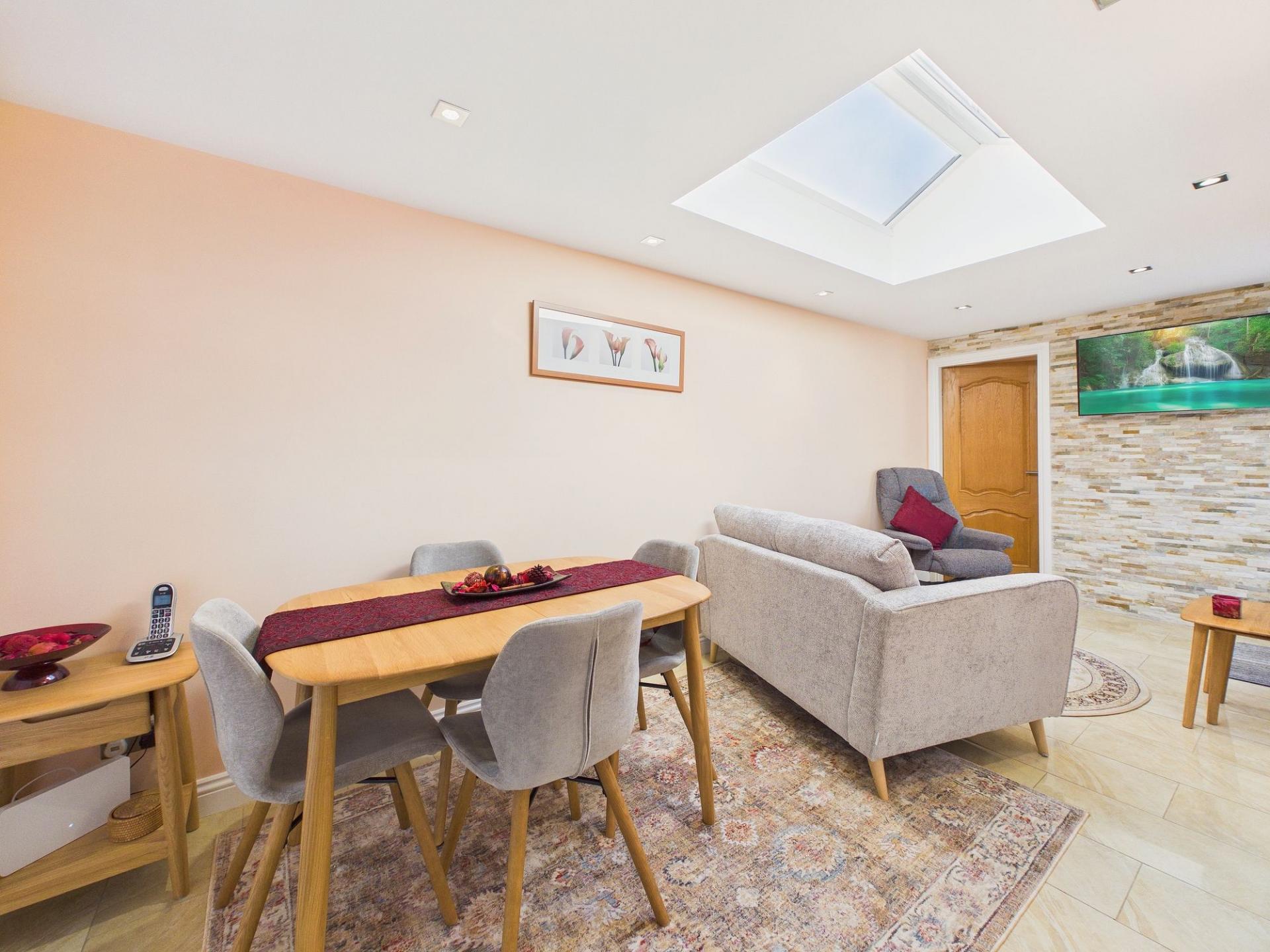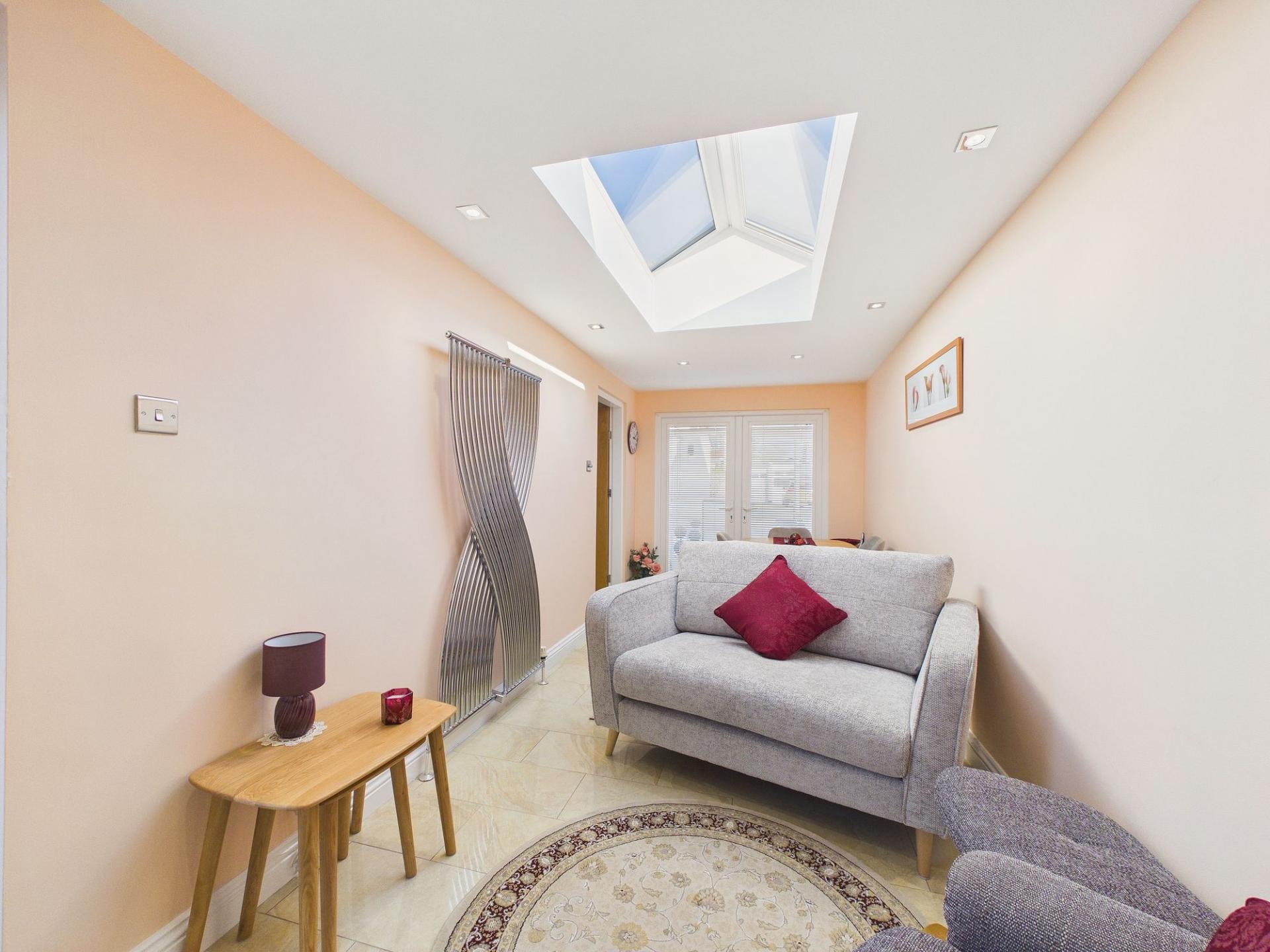 The dining room/snug is another standout feature of the home. Enhanced by a striking roof lantern that increases the introduction of natural light to the room. Patio doors lead onto the front of the property, there is a door to the utility room and a door opening onto the rear patio and garden, making it a wonderful space for entertaining or enjoying family meals. The room is generously sized and is shown accommodating both a dining table and chairs as well as additional lounge-style seating, offering flexibility for modern lifestyles.