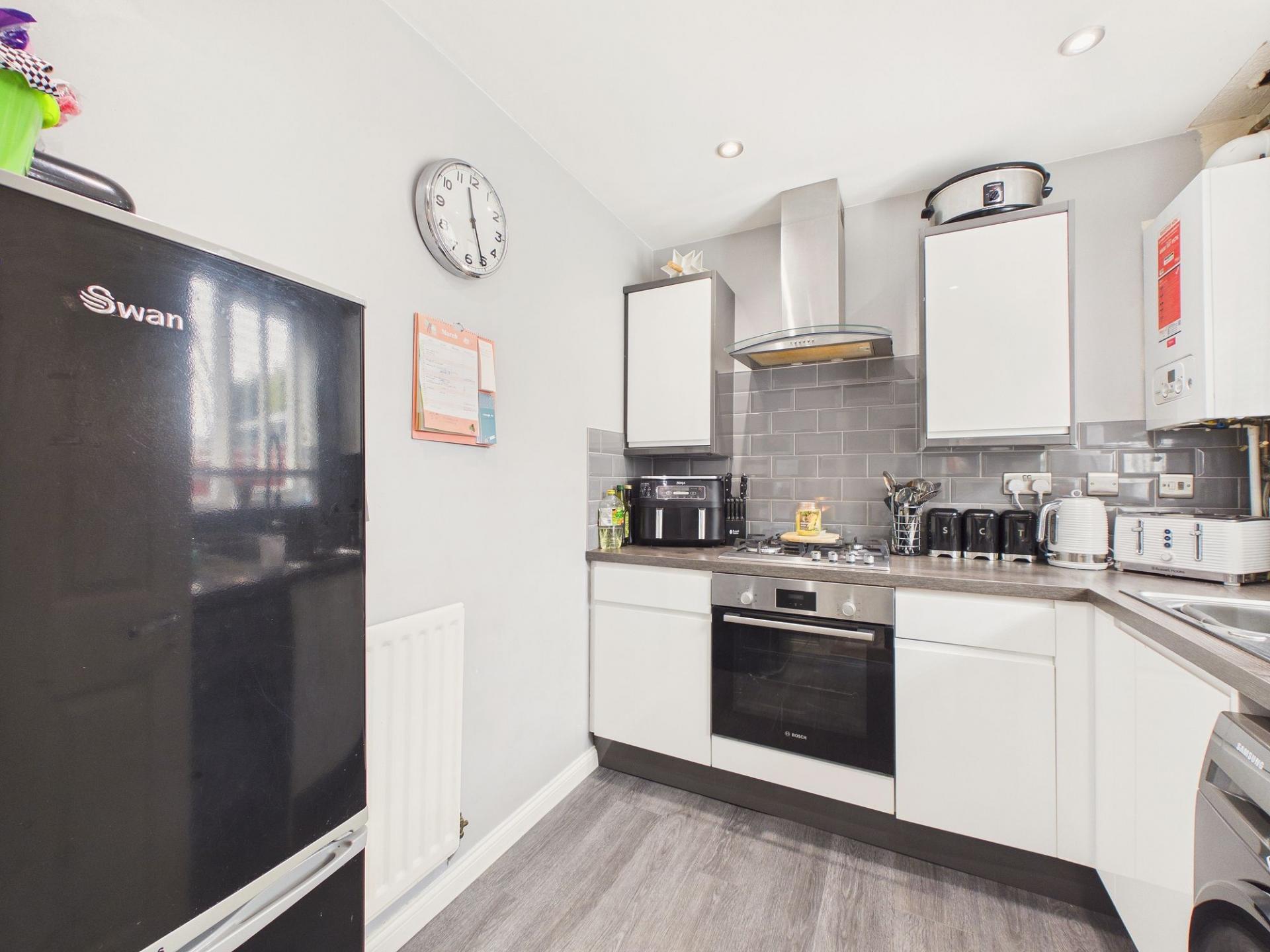 To the rear of the property, the kitchen is well-appointed with a range of modern wall and base units, offering ample storage and workspace. Built in cooking appliances provide added convenience, making this a practical and efficient area for everyday use, while also enjoying views over the rear garden.