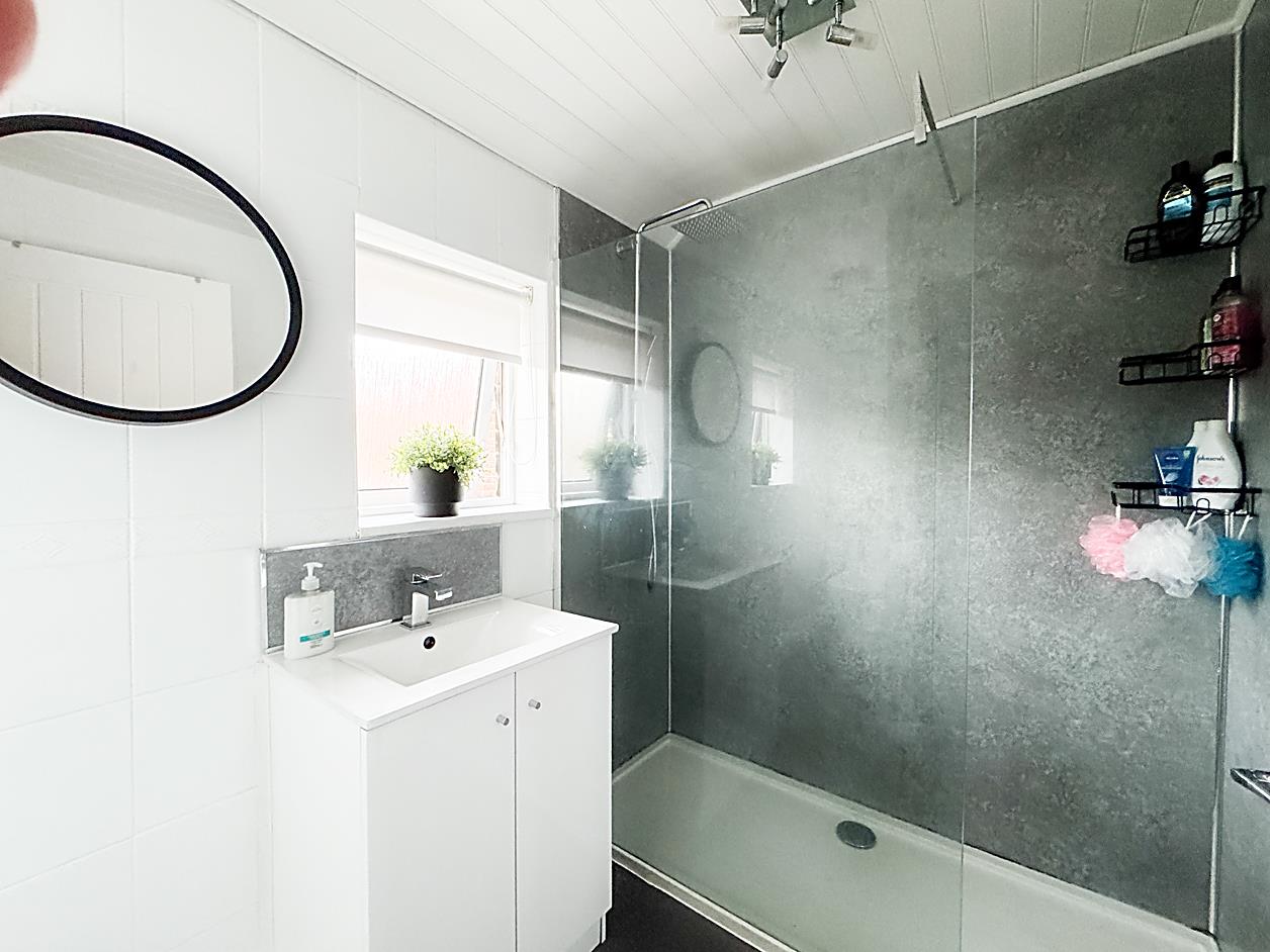 Bathroom - 3.36 max 1.66 max (11'0" max 5'5" max) - Two double glazed windows, ladder style radiator, part tiled and panelled walls, wash hand basin, WC and shower cubicle.