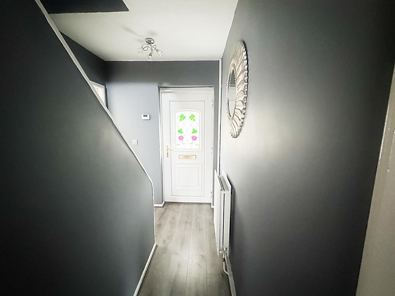 Hallway - Laminate Flooring, radiator, stairs to first floor, access to lounge and kitchen.