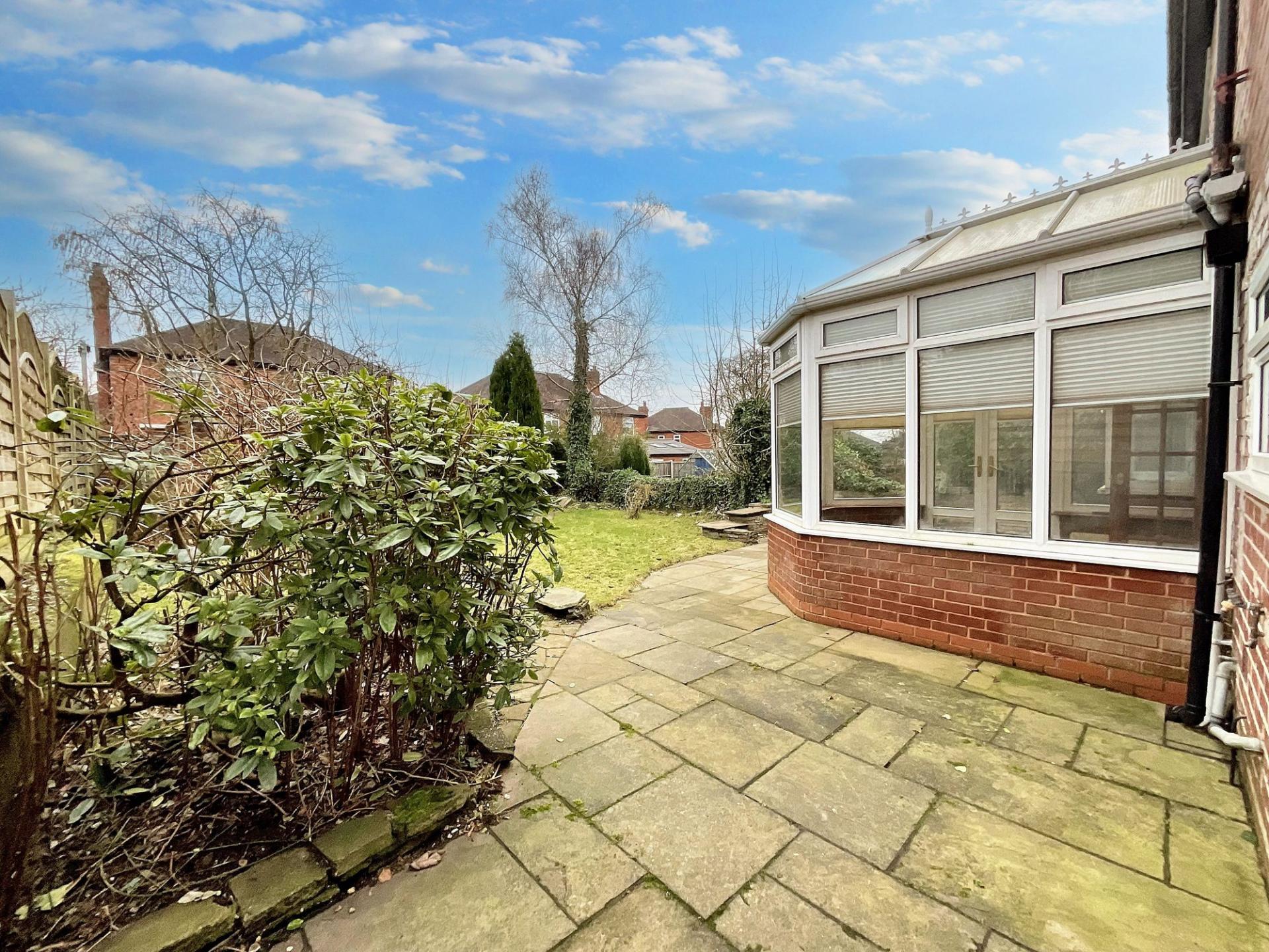 - Rear garden with ample patio seating space, a grass lawn, and mature borders. Driveway to the front with off-road parking, and a single garage for secure storage.