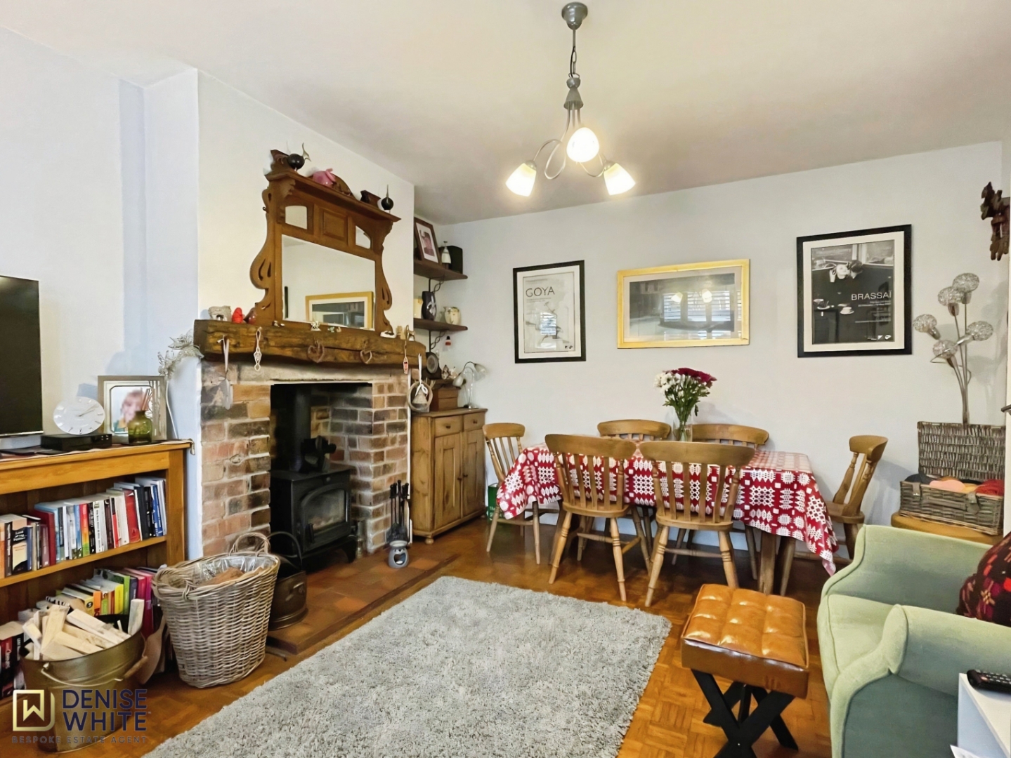 The property welcomes you with a spacious entrance hall, setting a bright and elegant tone. To the front, you'll find a cosy dining room complete with bespoke shutters, a striking log burner, exposed brick fireplace surround, wooden mantle, and beautifully maintained parquet flooring.