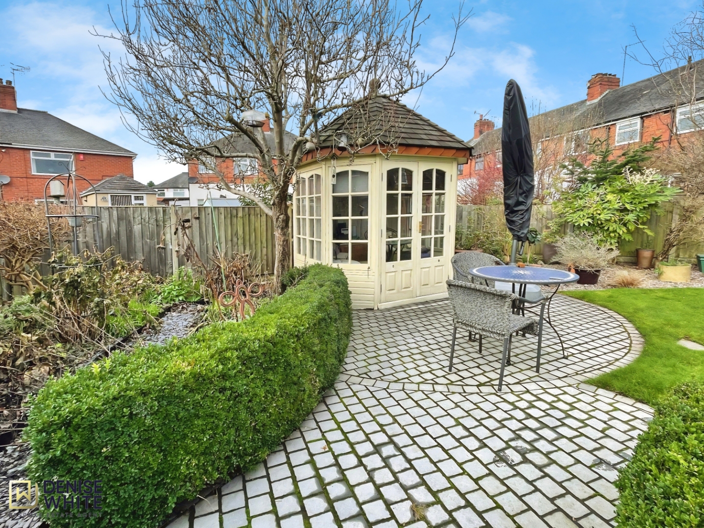 To the rear, the large and impressive garden offers exceptional outdoor space. A stone patio - accessible directly from the living room - provides a perfect spot for dining or relaxing. Beyond lies a generous lawn, well-stocked borders, and a charming cobbled area featuring a summerhouse and useful storage shed.