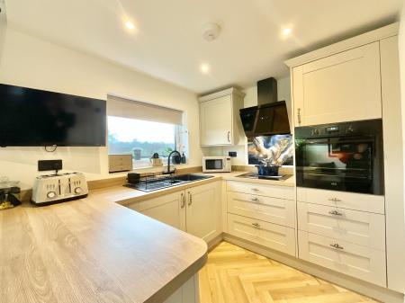 - Bay-fronted living room with log burner, open-plan to kitchen/diner with French doors, sleek grey cabinetry, washer/dryer, fridge/freezer, oven, 4-burner ceramic hob, plus a wc with wash hand basi...