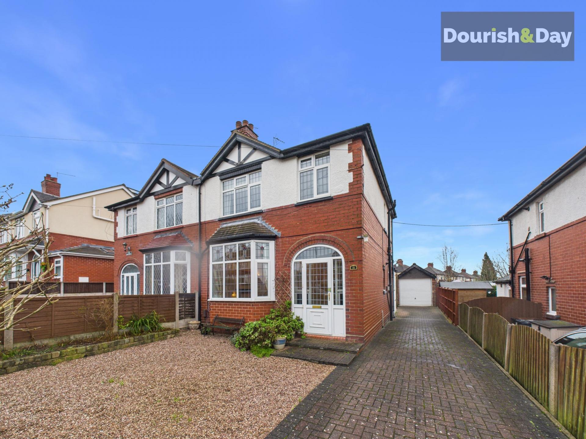 This attractive three-bedroom semi-detached family home sits proudly on this sought-after road in Newcastle-under-Lyme, offering a wonderful blend of period character, generous space and modern comfort. The property immediately impresses from the front, with an easy-to-maintain shale garden, raised flower beds, a long driveway providing ample off-road parking, and a single garage.