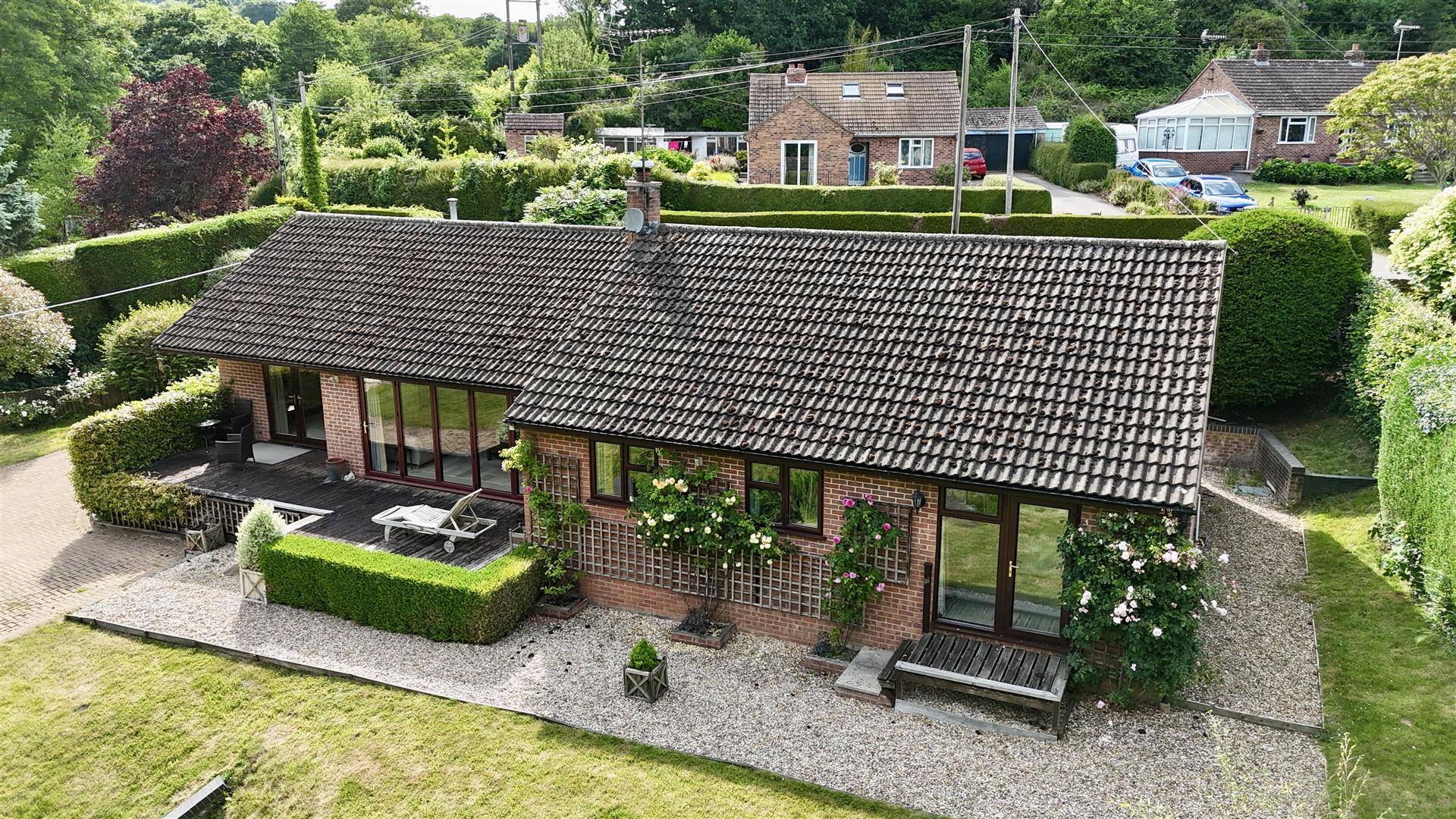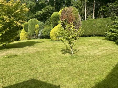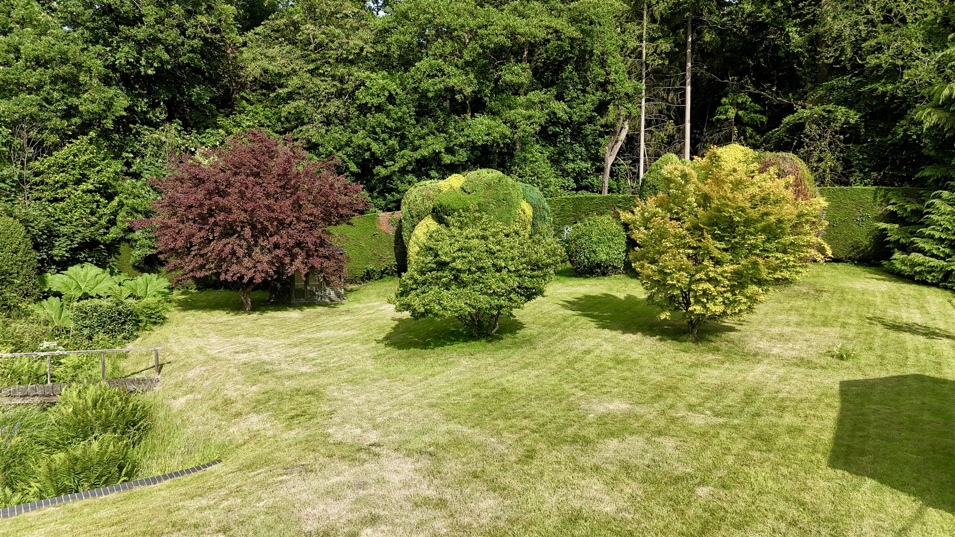 To the front of the property, there are gravelled pathways, raised lawned area, outside lighting, hedging surround. Access to either side of the property leads through to the main area of garden which is southerly facing. There is a raised decked area running the full length of the house with a lovely aspect over the gardens, gravelled pathway / patio area, large expanse of lawn with interspersed mature shrubs and bushes, summer house, attractive babbling brook running through the garden, high hedging surround, backing onto mature woodland and giving it a lovely, tranquil, mature setting. The whole plot is approaching half an acre.