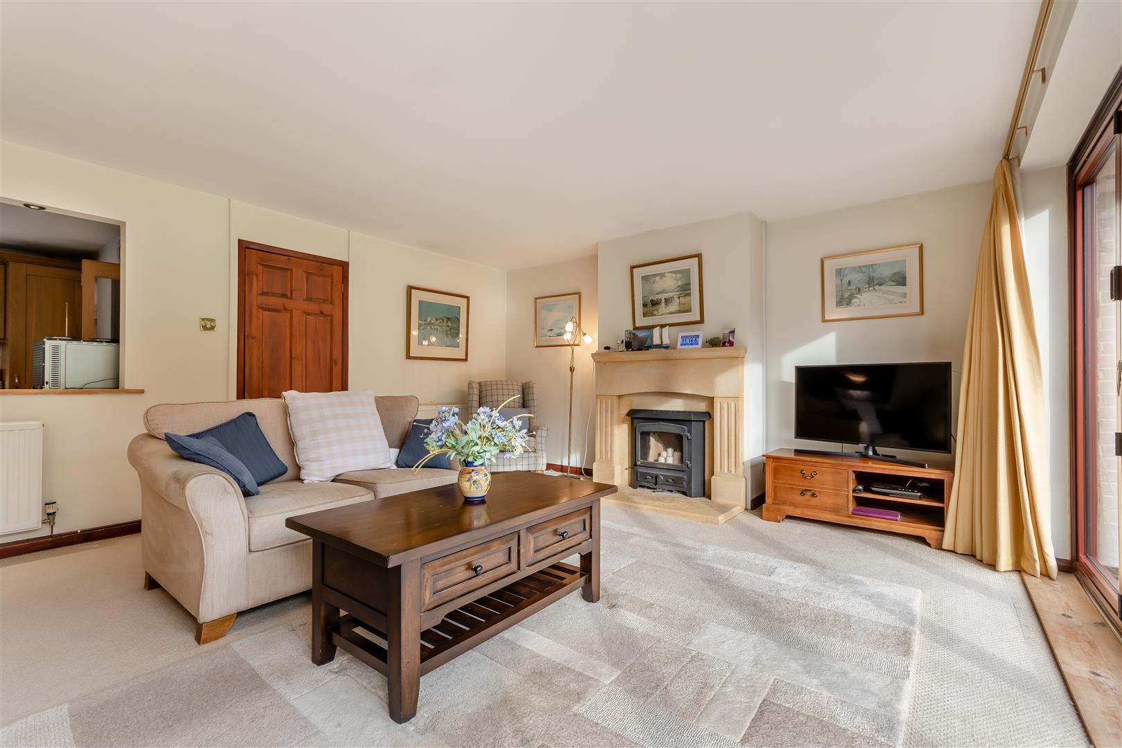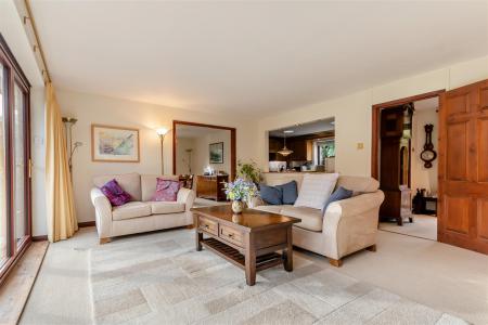 Living Room - 5.59m x 4.65m (18'4 x 15'3) - Attractive stone fireplace with inset wood burning stove (not tested), two double radiators, bi-fold patio doors running the full length of the rear of the house giving a fantastic southerly unspoilt outlook over the gardens onto woodland beyond. Opening through to: