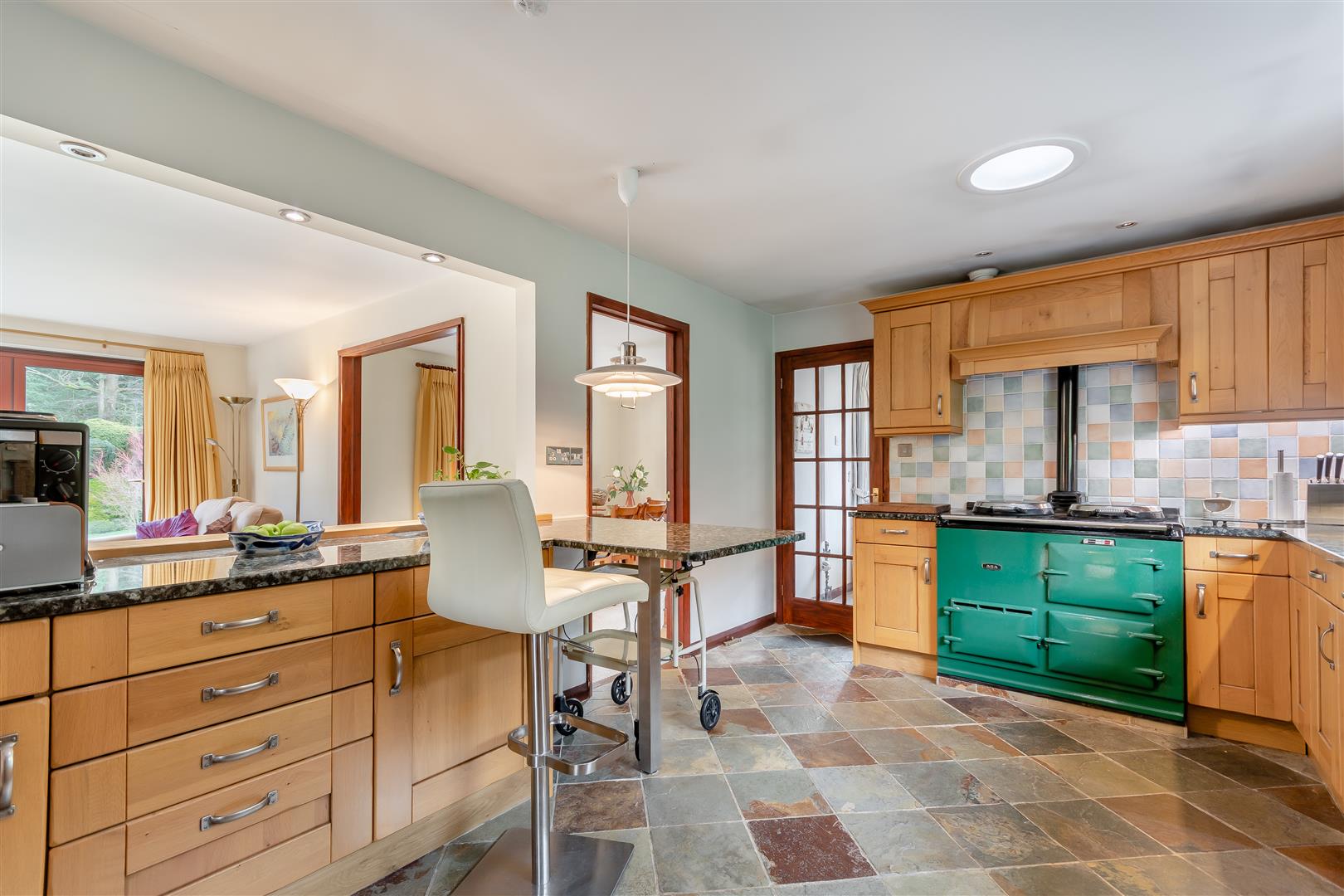 Kitchen - 4.62m x 3.20m (15'2 x 10'6) - Double bowl sink unit with mixer tap, drawer under, range of base and wall mounted units, oil-fired Aga cooking range with two hot plates, ovens below, spotlighting over, integrated fridge / freezer, integrated dishwasher, tiled flooring, large opening through to the living room, spotlighting, front aspect window with a private outlook. Fully glazed door leads to: