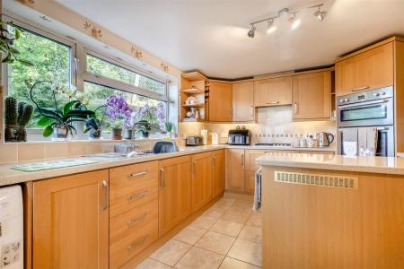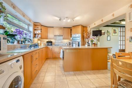 Kitchen / Breakfast Room - 4.70m x 3.18m (15'5 x 10'5) - One and a half bowl single drainer sink unit with mixer tap, cupboards under, range of base and wall mounted units, integrated electric double oven, cupboard above and below, four ring gas hob, cooker hood above, built-in pantry cupboard with shelving, breakfast bar, plumbing for washing machine, double radiator, tiled flooring, rear aspect window with a private outlook onto open fields. Opening through to: