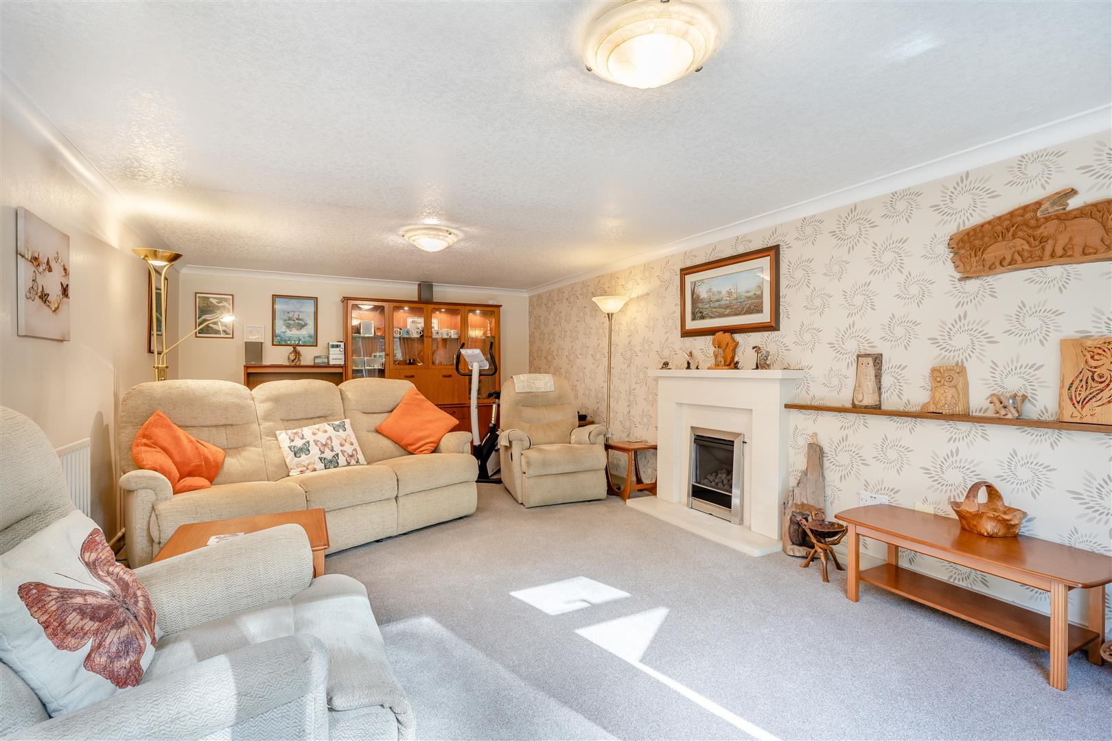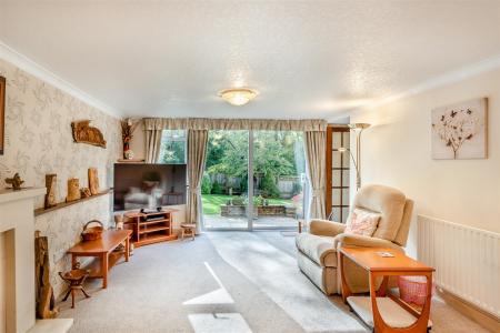 Lounge - 6.60m x 3.63m (21'8 x 11'11) - Stone fireplace with raised hearth, inset gas fire, radiator, coving, front aspect window, double glazed sliding patio doors through to the front with a private outlook onto the gardens and mature trees.
