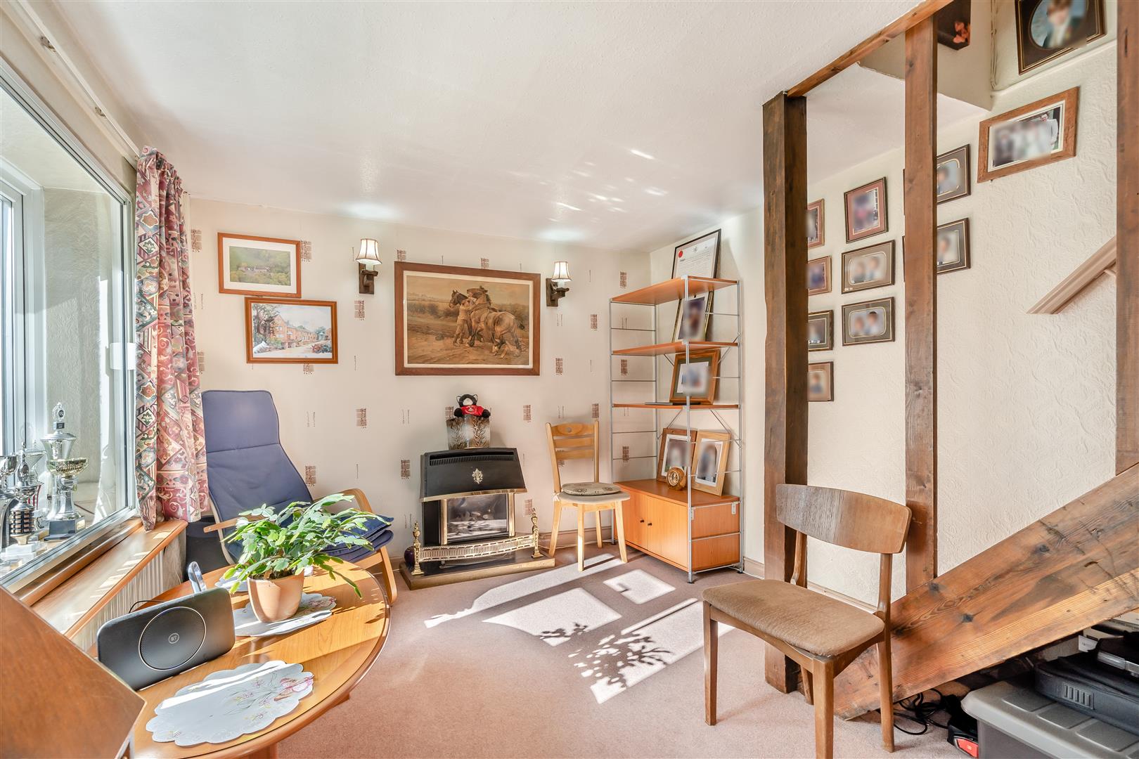 Dining Area - 2.95m x 2.46m (9'8 x 8'1) - Built-in cupboard with shelving, ceiling beams, front aspect window overlooking the gardens and onto mature trees.