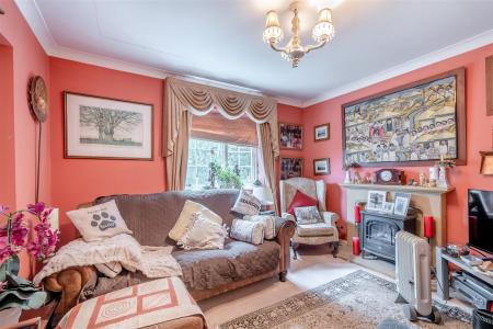 Lounge - 6.76m x 4.57m (22'2 x 15') - Feature fireplace with inset electric effect wood burning stove, three double radiators, side and rear aspect windows with a private outlook over the gardens, fully glazed UPVC doors through to: