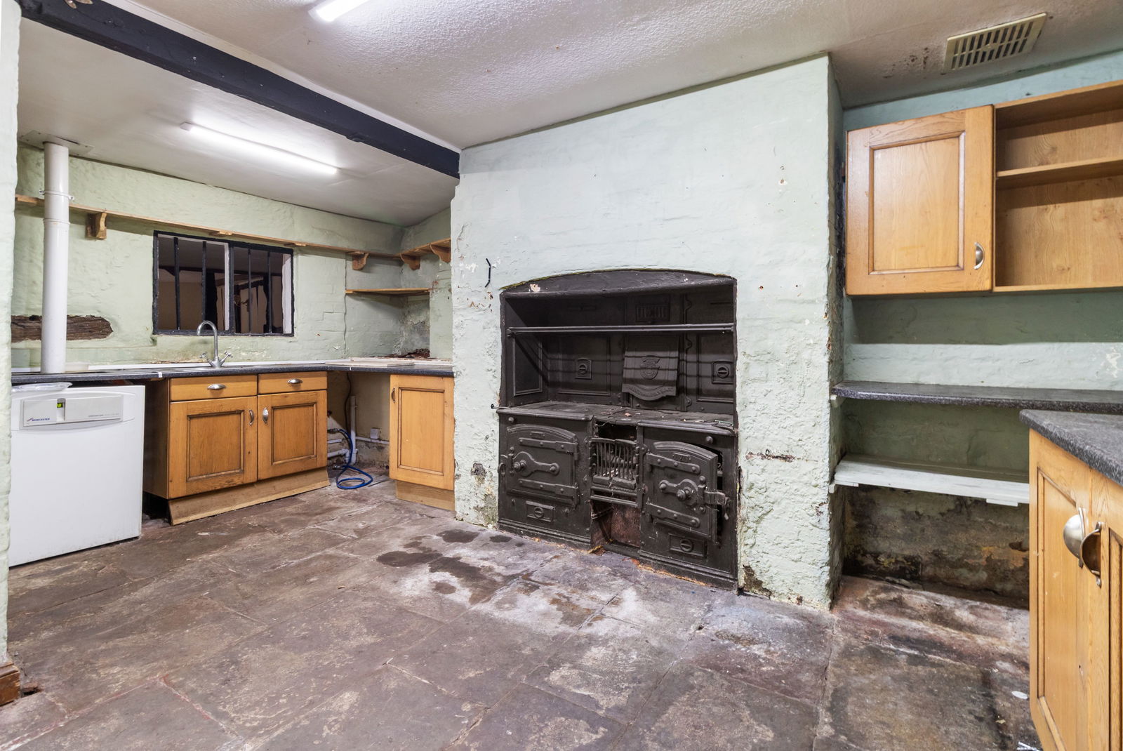 Strip lighting. A range of wall and base units with a laminate worktop and inset stainless steel sink and drainer. 'Greenstar' Boiler. Double glazed window to the side aspect. Flagstone flooring. Original Range style cooker (assumed not in use)