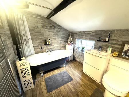 Bathroom - 2.39m x 2.16m (7'10 x 7'01) - Fitted roll top bath, shower attachment over, vanity wash hand basin, drawers below, close coupled w.c., timber effect tiled flooring, heated towel rail, rear aspect window.