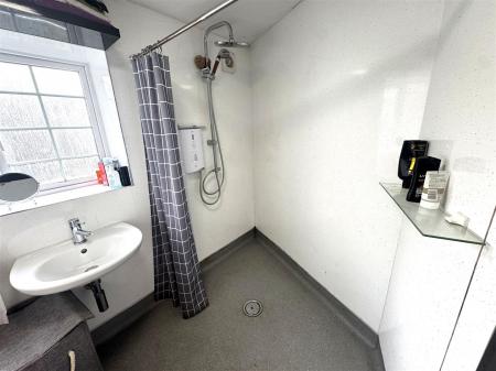 Ground Floor Wet Room - Shower area with panelled surround, electric shower, wash hand basin, close coupled saniflow w.c., heated towel rail, extractor fan, access to roof space, front aspect frosted window.