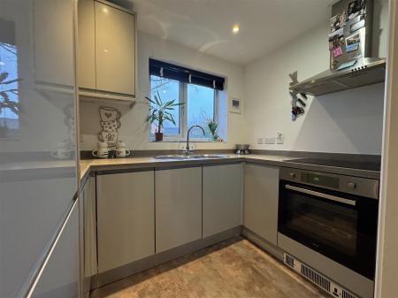 Kitchen - 2.62m x 2.44m (8'07 x 8'0) - A range of base, wall and drawer mounted units, single bowl single drainer stainless steel sink unit with mixer tap above, integrated fridge / freezer, oven, four ring hob and cooker hood, integral dishwasher.