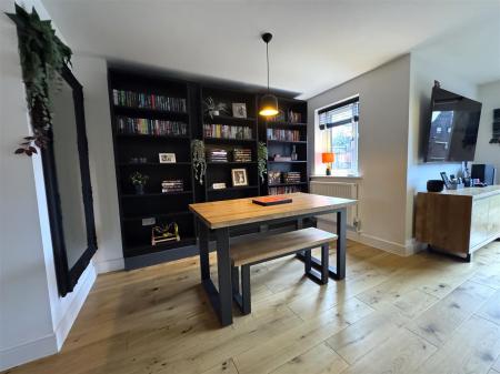 Open Plan Lounge / Dining Room - L-Shaped - 6.02m x 4.72m (19'09 x 15'06) - Wood effect flooring, radiators, built-in shelving units, door to airing cupboard, rear aspect double glazed UPVC window, double glazed UPVC bi-fold doors leading to the garden.