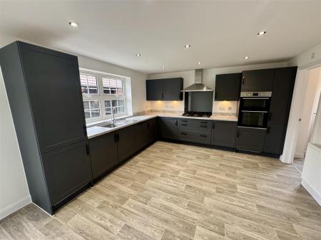 Kitchen/Diner - 7.29m x 3.81m max (23'11 x 12'06 max ) - Fitted kitchen to comprise a single drainer sink unit with mixer tap above, range of base and wall mounted units, integrated electric double oven, five ring gas hob and cooker hood above, integrated dishwasher and fridge freezer, two double radiators, rear aspect window overlooking the gardens. Fully glazed French doors leading out to the rear patio. Door into: