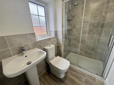 En Suite Shower Room - Double fitted shower cubicle and tray with tiled surround, low level W.C, pedestal wash hand basin, heated towel rail, side aspect frosted window.