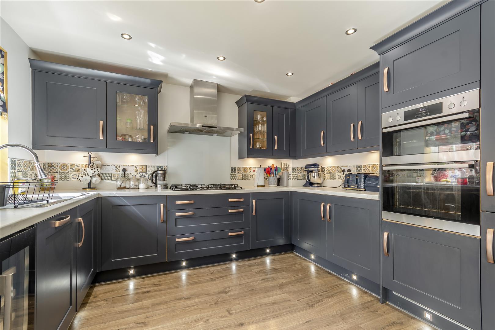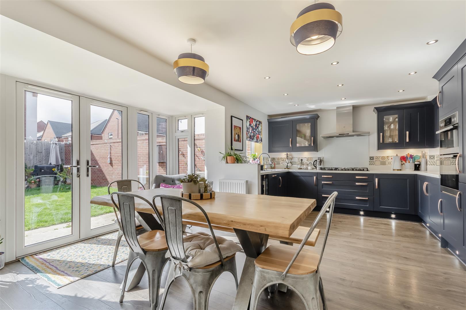 Kitchen/Dining/Family Room - 7.98m x 4.93m (26'02 x 16'02) - Modern kitchen comprising range of base and wall mounted units, one and a half bowl sink unit, five ring gas hob, extractor over, integrated dishwasher, fridge/freezer and wine fridge, rear aspect feature bay window, patio doors to the rear garden. Door to: