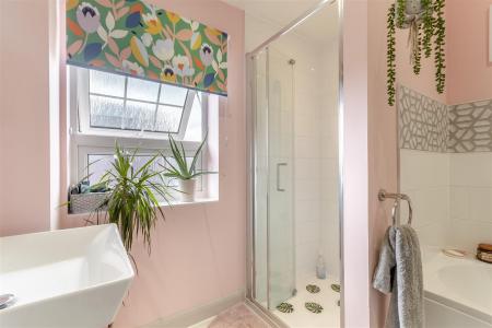 Family Bathroom - 2.84m x 2.34m (9'04 x 7'08) - White suite comprising bath, separate shower cubicle, sink unit, wc, chrome heated towel rail, part tiled walls, tiled floor, rear aspect window.