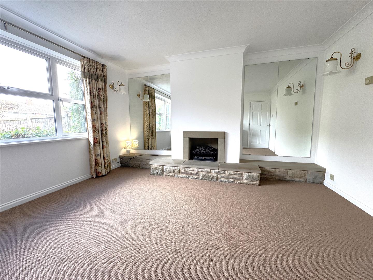 Lounge - Stone fireplace housing inset living flame gas fire (currently disconnected), single radiator, wall light fittings, thermostat control, front aspect window.