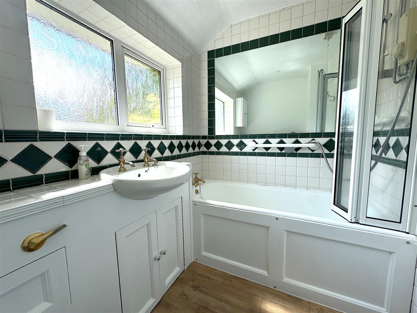 Bathroom - 2.31m x 1.65m (7'7 x 5'5) - Three piece white suite comprising wood panelled bath with Mira electric shower over, vanity wash hand basin with cupboard below, built-in WC, laminated floor, tiled splashbacks, single radiator, inset spotlighting, rear aspect frosted window.