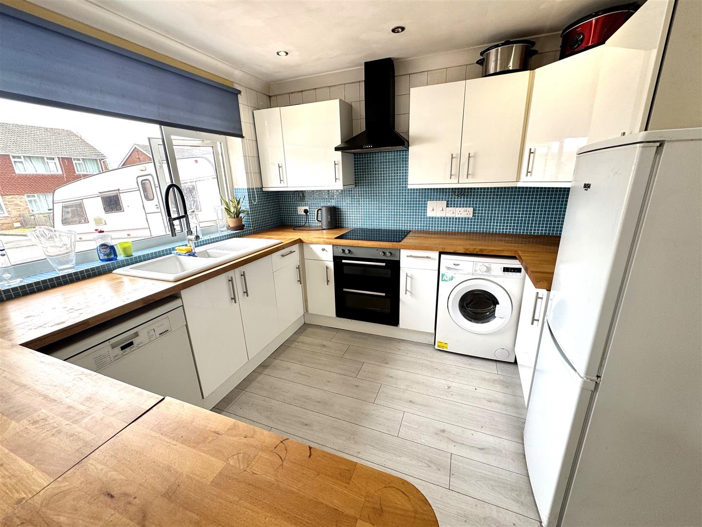 Family Kitchen/Dining Room - 6.17m x 3.91m (20'03 x 12'10) - One and a half bowl single drainer sink unit, mixer tap, cupboards under, range of base and wall mounted units, integrated electric double oven, four ring induction hob over, cooker hood above, fitted Miele dishwasher, Bush washing machine, space for fridge/freezer, electric panel heater, two large front aspect windows.