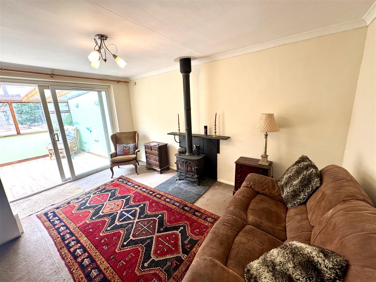 Lounge - 4.39m x 3.35m (14'05 x 11'00) - Wood burning stove, tiled hearth, stairs to the first floor. Sliding patio doors to: