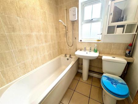 Bathroom - White suite comprising modern panelled bath, electric shower over, tiled surround, pedestal wash hand basin, tiled splashback, close coupled w.c., heated towel rail, side aspect frosted window.