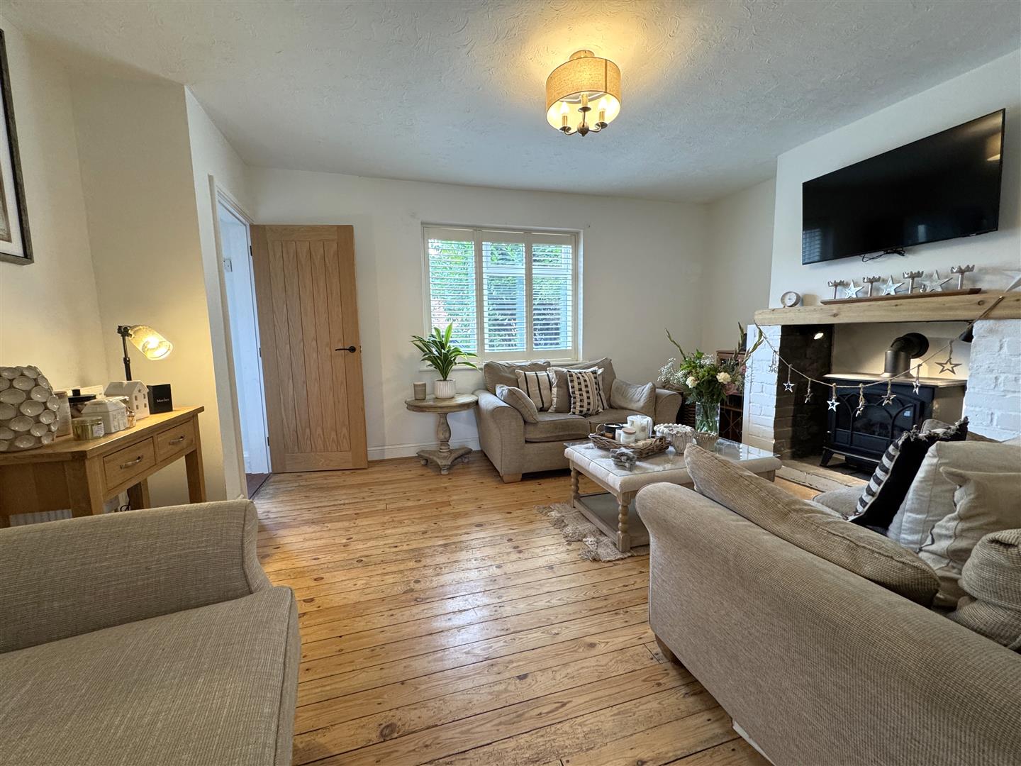 Lounge - 4.72m x 3.53m (15'6 x 11'7) - Stripped wooden floor, brick fireplace with inset electric fire, wooden mantle over, radiator, door to under stairs storage cupboard, front aspect window with fitted shutters.