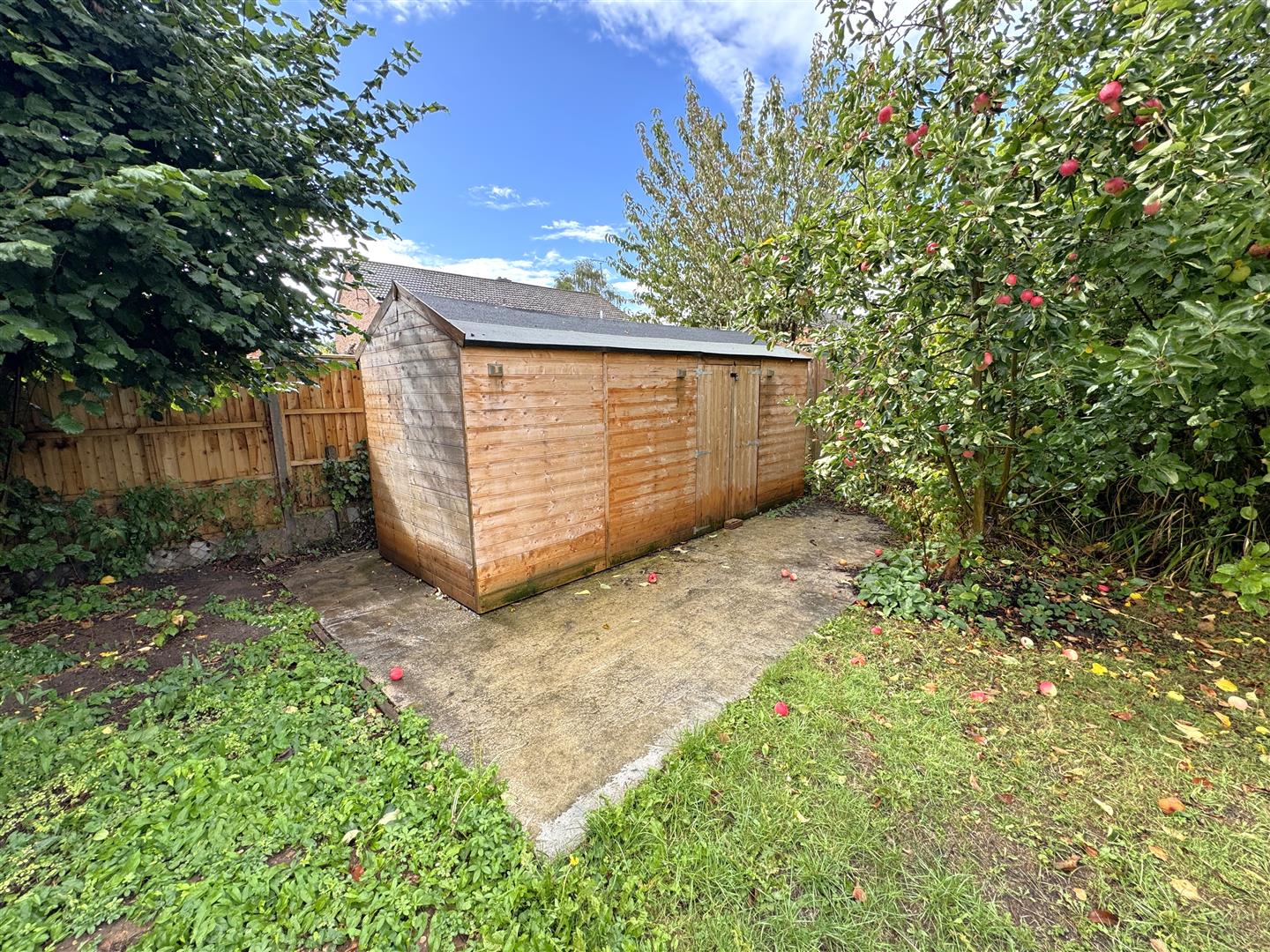 The rear garden has a gravelled patio area, paved and concrete patio area, large lawned area, concrete base to the end of the garden with a LARGE WOODEN SHED / WORKSHOP.